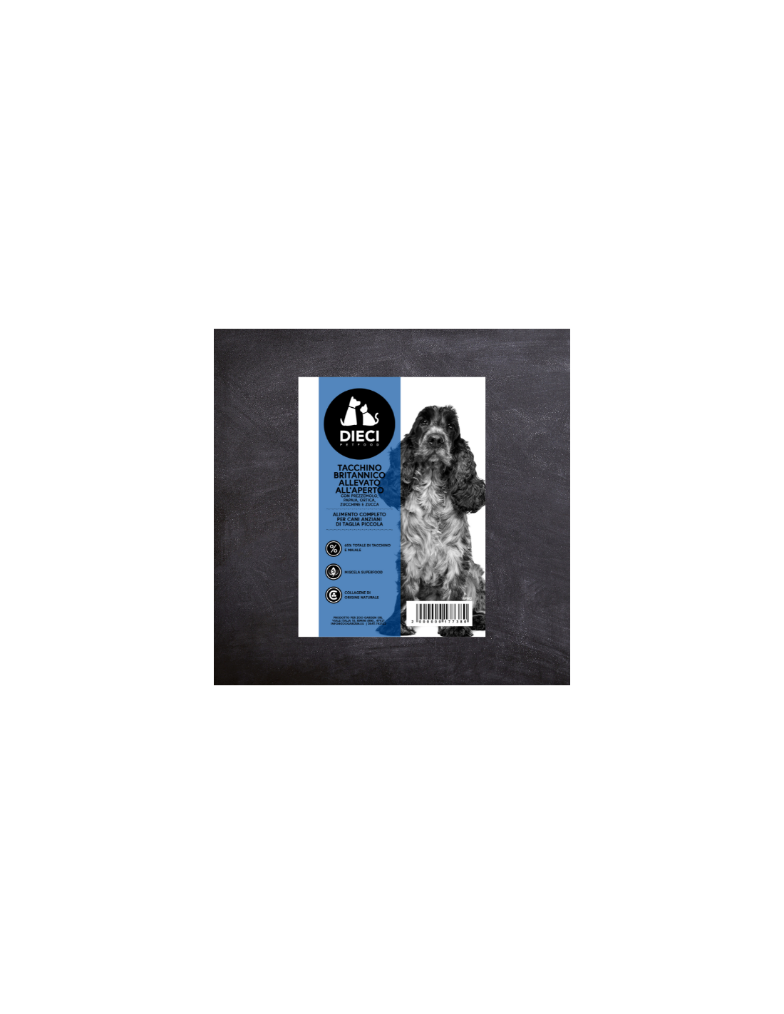 COMPOSIZIONE: 65% tacchino e maiale (35% tacchino di allevamento all’aperto appena preparato, 14% maiale essiccato,