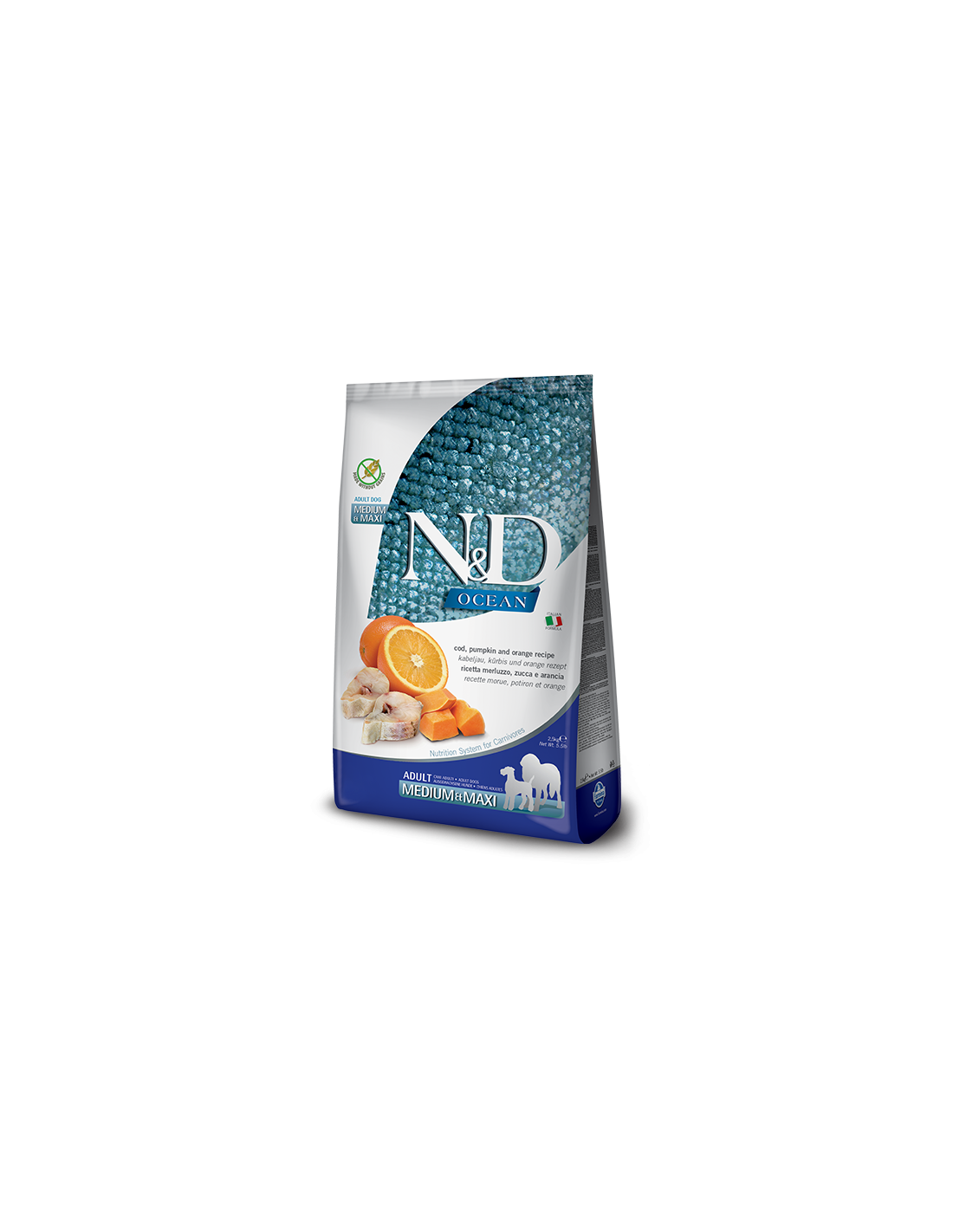 merluzzo (25%), proteine di merluzzo disidratate (25%), amido di pisello, olio di pesce (da aringa), zucca disidratata (5%), fibra di piselli, carote essiccate, farina di erba medica, inulina, fruttoligosaccaridi, estratto di lievito (fonte di manno-oligo-saccaridi), arancia dolce essiccata (0.5%), mela essiccata, melograno essiccato, spinaci essiccati, bucce e semi di psillio (0.3%), mirtillo essiccato, cloruro di sodio, lievito di birra essiccato, curcuma (0.2%), estratto di aloe vera, glucosamina, solfato di condroitina.