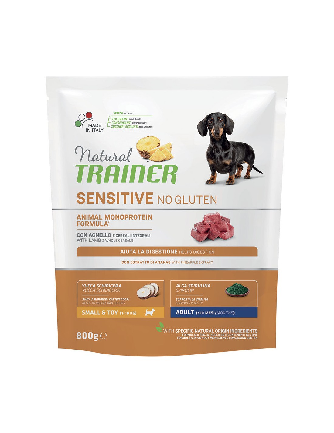 Composizione: proteine disidratate di agnello 14,5% , granturco integrale 14% , fioretto di granturco , piselli disidratati , proteina di granturco , farinaccio di riso , strutto , agnello 4% , riso integrale 4% , semi di lino* , proteina idrolizzata di pisello , proteina di pisello , riso , sostanze minerali , concentrato secco di radice di cicoria (fonte di inulina)* 0,7% , olio di granturco , lignocellulosa , concentrato secco di gambo di ananas* 0,1% , Yucca schidigera disidratata* 0,025% , spirulina (Arthrospira platensis)* 0,02%. , *Ingredienti specifici di origine naturale.