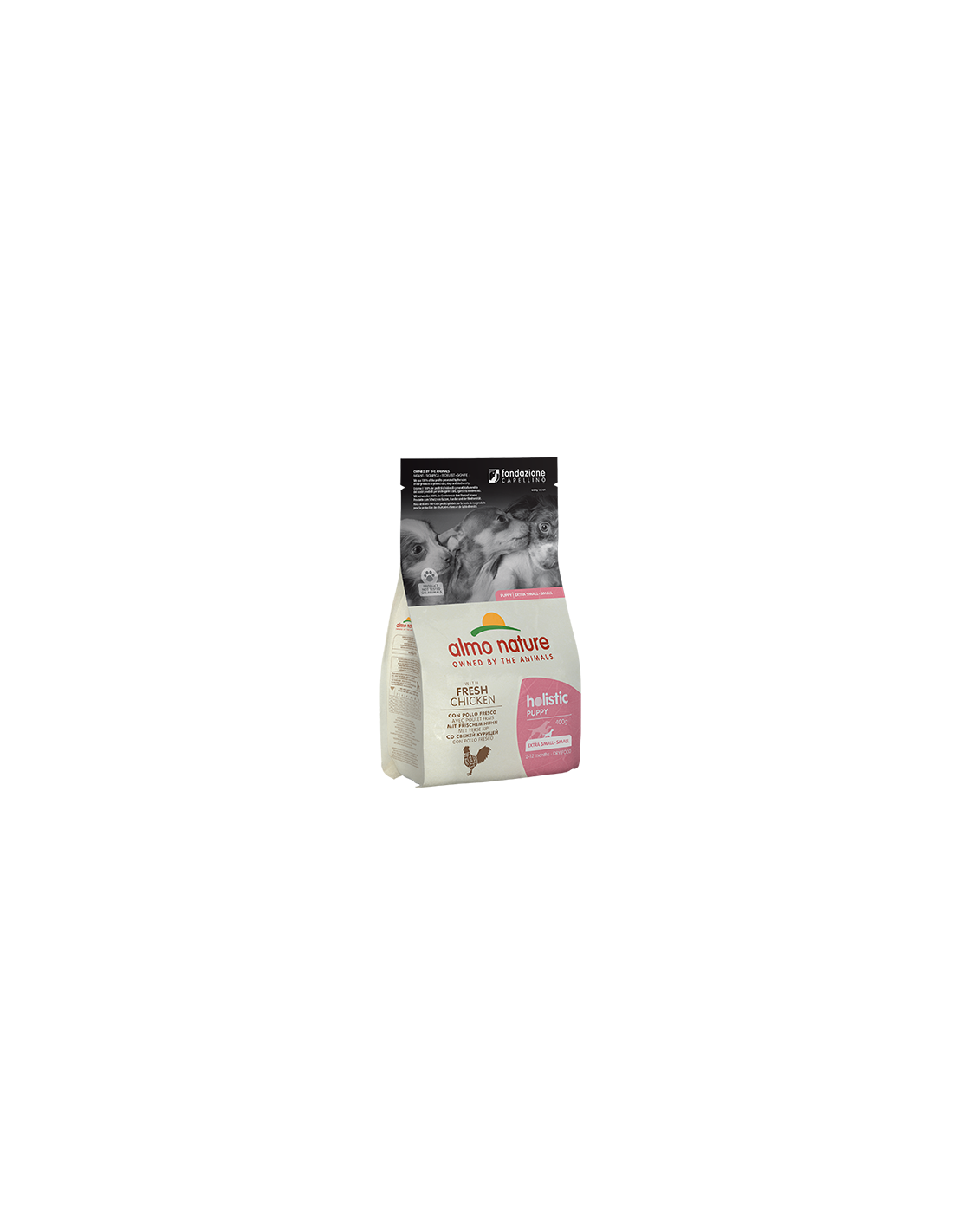Pollo 42,8% (pollo fresco 26%, pollo disidratato 16,8%), granturco*, riso, farina di riso integrale, manzo disidratato 5,2%, grasso di pollo, proteine animali idrolizzate, lievito, olio di salmone**, mannano-oligo-saccaridi 0,1%, inulina di cicoria fonte di FOS 0,1%. *No OGM. **Fonte naturale di omega 3.