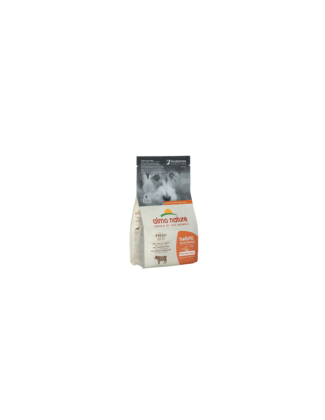 Manzo 29,2% (manzo fresco 26%, manzo disidratato 3,2%), granturco*, riso, pollo disidratato 12,5%, farina di riso integrale, grasso di pollo, proteine animali idrolizzate, polpa di barbabietola, lievito, sostanze minerali, mannano-oligo-saccaridi 0,1%, inulina di cicoria fonte di FOS 0,1%, yucca schidigera 0,01%. * No OGM.