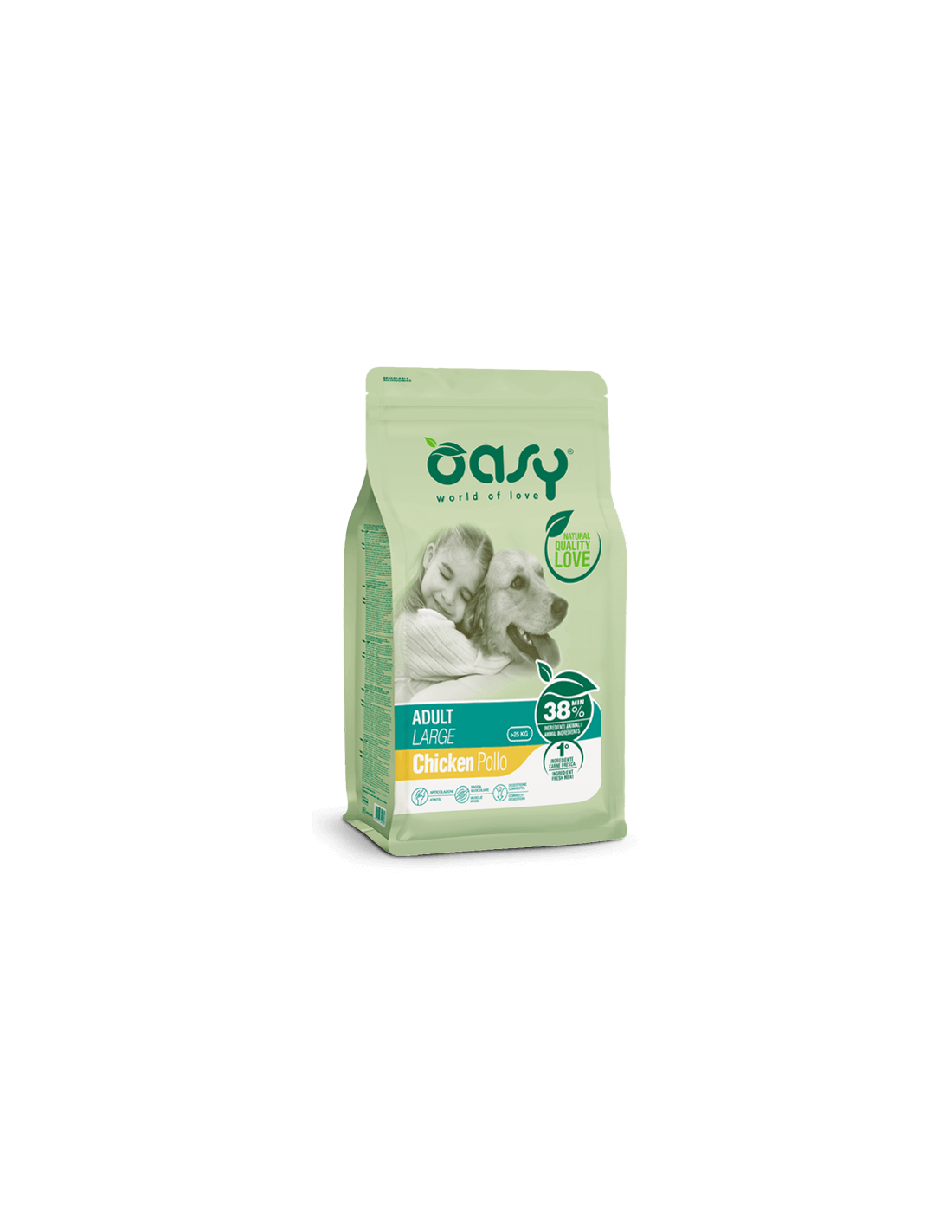 pollo fresco 20%, mais, pollame disidratato 17% (di cui pollo 6%), frumento, orzo, riso, grasso di pollame, polpa di barbabietola 3%, fegato di pollame idrolizzato 2,5%, glutine di mais, pesce disidratato 1%, lievito di birra, cicoria 0,5%, uova intere disidratate 0,2%, sostanze minerali, Yucca schidigera 170 mg/kg, mannanoligosaccaridi 60 mg/kg, glucosamina, solfato di condroitina.