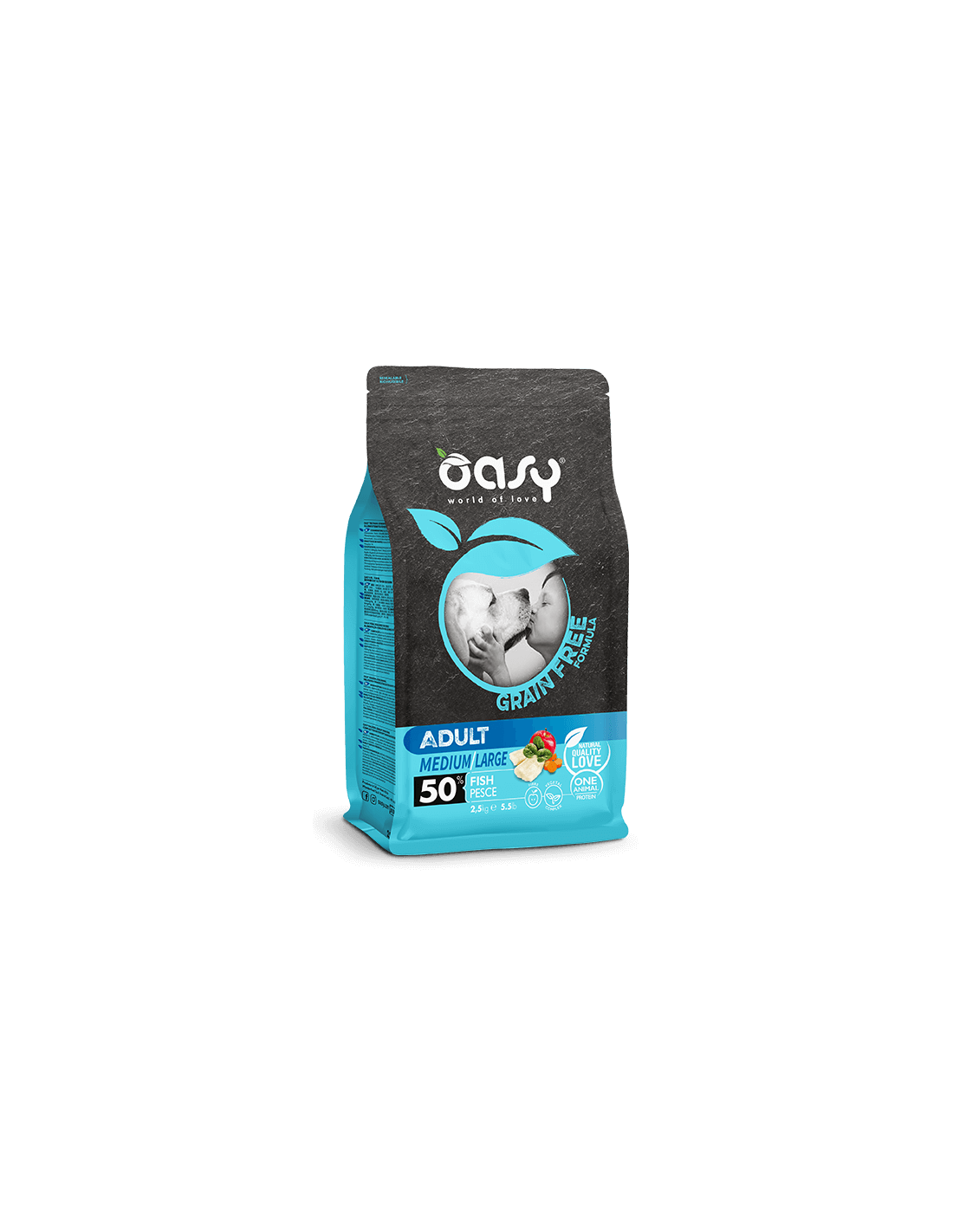 pesce fresco 30%, pesce disidratato 17%, patate, piselli, patata dolce, grasso animale, polpa di mele 4%, salmone idrolizzato 3%, semi di lino, lievito di birra, proteina di piselli, complesso vegetale 0,8% (zucca, spinaci, pomodoro, carote, mirtillo rosso, rosa canina, salvia, origano, rosmarino), minerali, olio di pesce, cicoria 0,1%, mannanoligosaccaridi 0,1%, glucosamina, Yucca schidigera, solfato di condroitina.