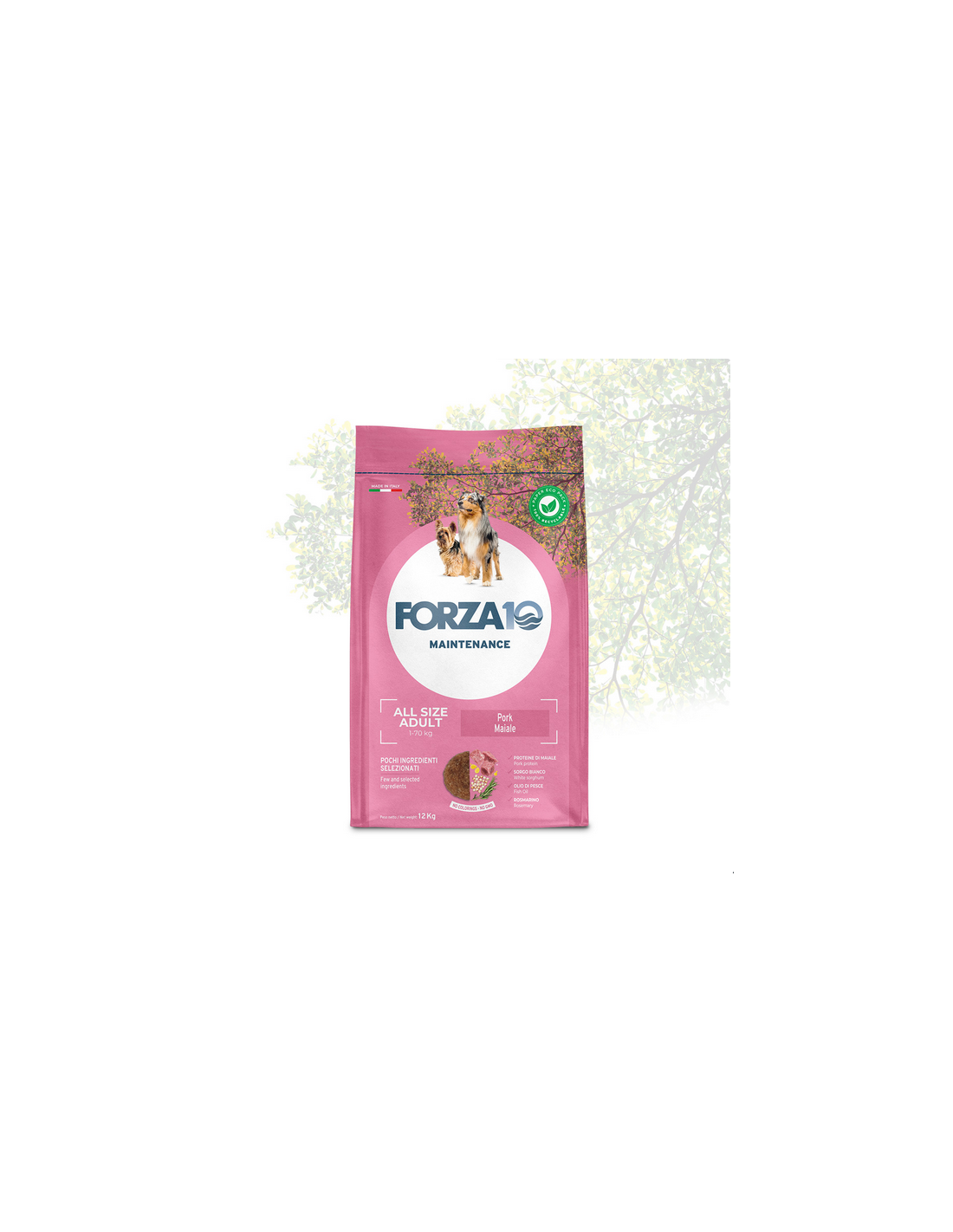 Composizione: proteine trasformate di suino 27%, granturco, sorgo bianco, cruschello di riso, grasso di pollo, prodotti di origine animale, olio di pesce, sostanze minerali, mannano oligosaccaridi (MOS), FOS, Yucca schidigera.