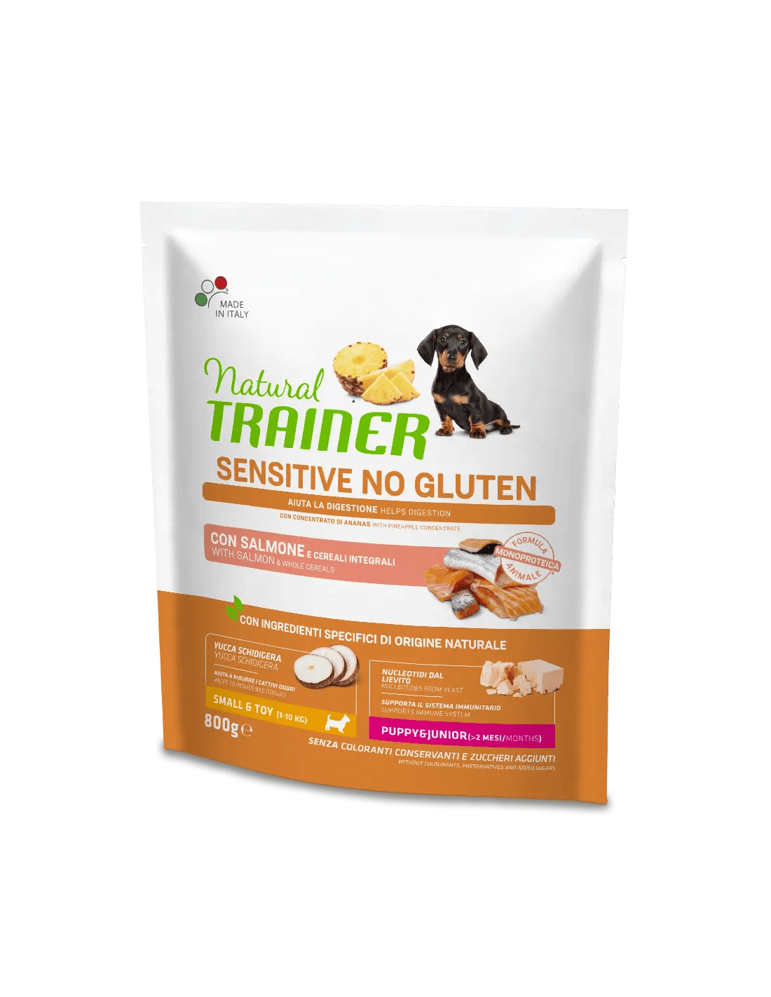 trainer natural sensitive dog 800gr small&toy puppy&junior salmone cereali