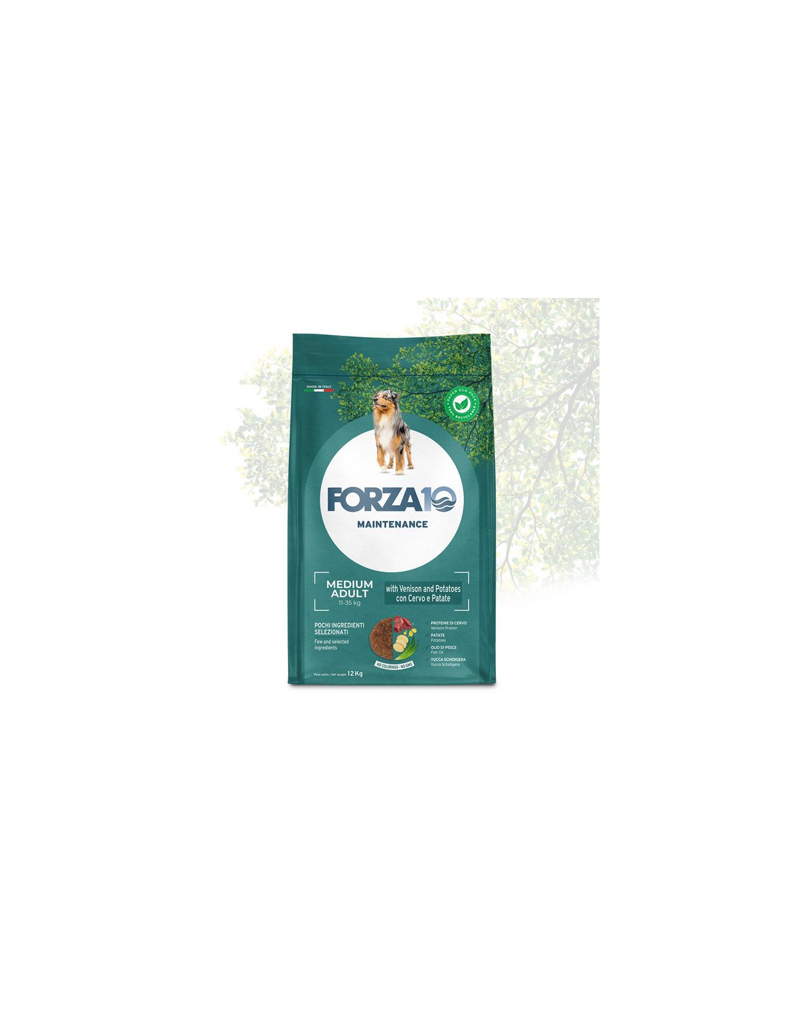 Composizione: proteine animali trasformate (agnello, cervo 6.1%), mais, sorgo bianco, riso, patata 4.1%, olio di pesce, polpa di barbabietola, olio di mais, sostanze minerali, lievito disidratato (Bio MOS), FOS, Yucca schidigera.