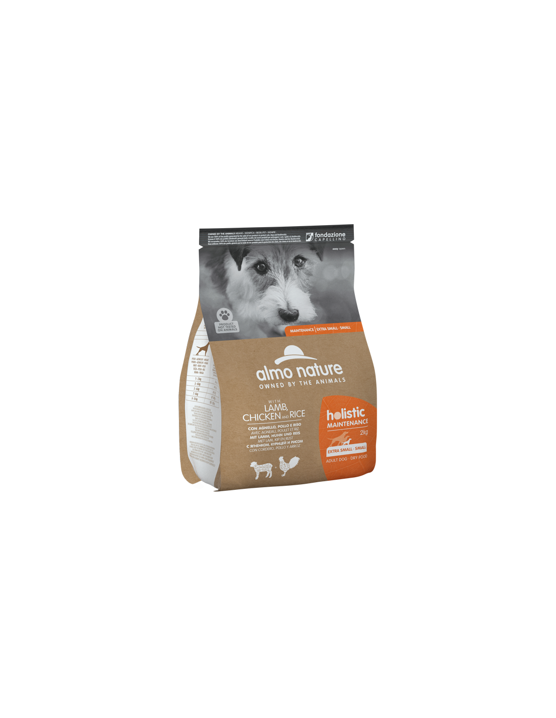 Carni e derivati 46,6% (pollo 15%, agnello 8%), cereali (riso 4%), oli e grassi (grasso di pollo 6,9%, olio di salmone* 0,5%), sottoprodotti di origine vegetale (polpa di barbabietola 1%,inulina di cicoria - fonte di FOS- 0,1%), lieviti, glucosamina 0,01%, solfato di condroitina 0,01%. *Fonte naturale di omega 3.