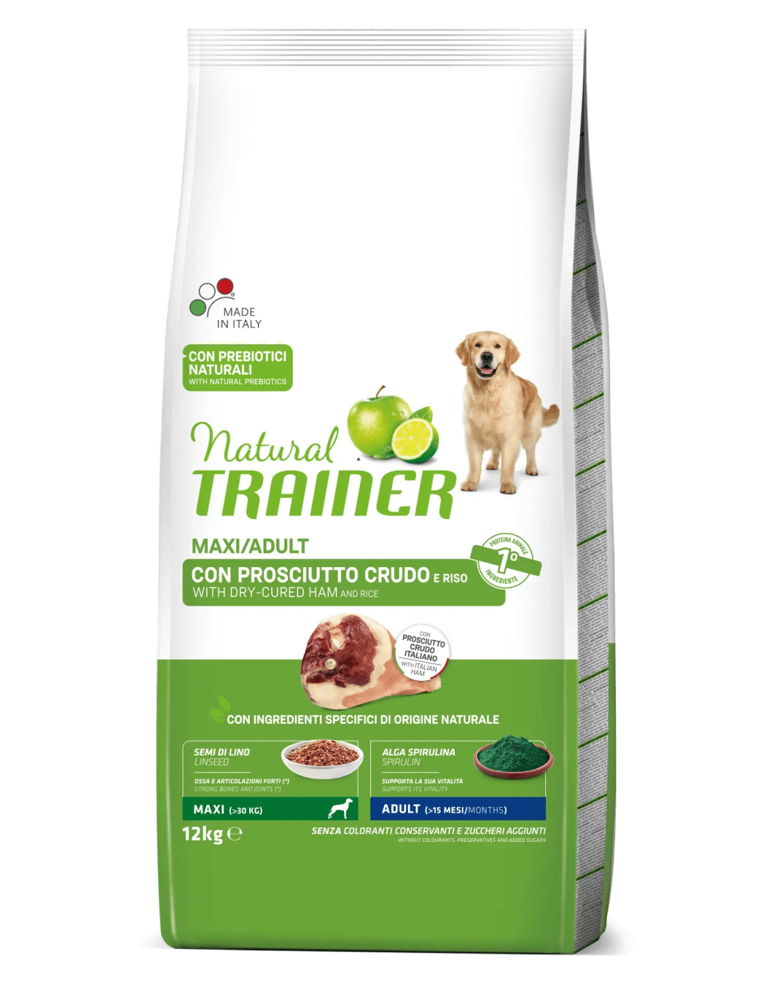 Composizione: pollo fresco 18% , granturco , fioretto di granturco , riso 10% , proteine disidratate di prosciutto crudo 100% italiano 9% , proteina di granturco , piselli disidratati , proteine disidratate di pollo e tacchino , grasso di pollame , proteine animali idrolizzate (pollame, maiale, pesce) , semi di lino* 2,5% , polpa di barbabietola* , concentrato secco di radice di cicoria (fonte di inulina)* 0,6% , olio di granturco , sostanze minerali , lignocellulosa , mela disidratata in polvere* 0,15% , concentrato di limone in polvere* 0,1% , spirulina (Arthrospira platensis)* 0,1% , peptidi di collagene bioattivi 0,06%. , *Ingredienti specifici di origine naturale.