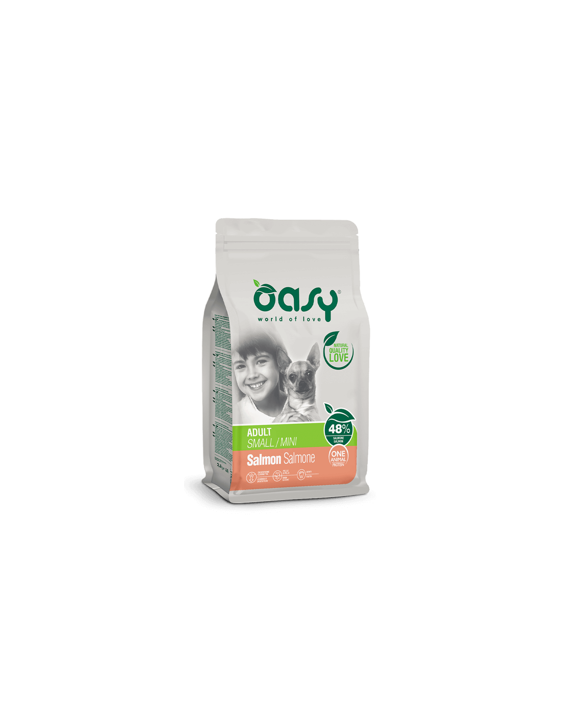 salmone fresco 30%, riso, salmone disidratato 15%, proteina di riso, grasso animale, salmone idrolizzato 3%, polpa di barbabietola 2,5%, lievito di birra 1%, sostanze minerali, olio di pesce, inulina 1.000 mg/kg (fonte di fruttoligosaccaridi), zenzero 0,1%, mannanoligosaccaridi 1.000 mg/kg, Yucca schidigera 170 mg/kg.