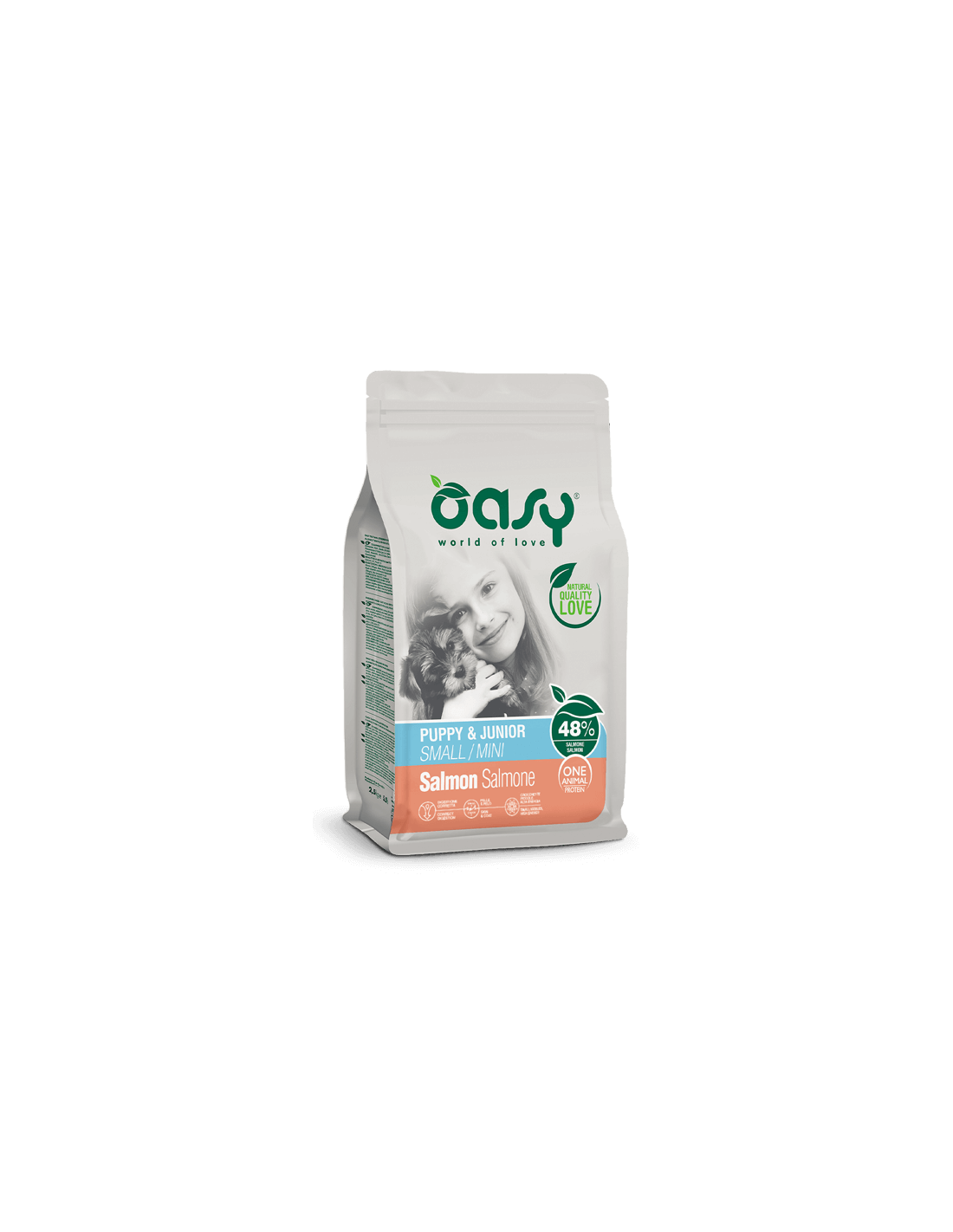 salmone fresco 30%, riso, salmone disidratato (15%), proteina di riso, grasso animale, salmone idrolizzato 3%, proteina di patate, polpa di barbabietola 2,5%, lievito di birra 1%, semi di lino, sostanze minerali, inulina 1.000 mg/kg (fonte di fruttoligosaccaridi), zenzero 0,1%, mannanoligosaccaridi 1.000 mg/kg, Yucca schidigera 170 mg/kg.