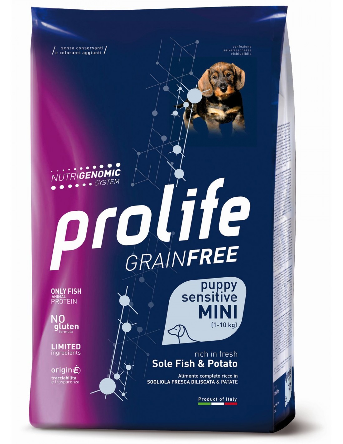 Sogliola fresca diliscata* 32%, Patate 24,6%, Pesce disidratato 11,6%, Grasso di pollo, Tapioca, Polpa di barbabietola, Proteina di patata, Alltech® Nutrigenomic System Puppy 2%, Polvere di carruba, Proteine idrolizzate di pesce, Sostanze minerali, Inulina di cicoria - fonte di FOS - 0,1%.