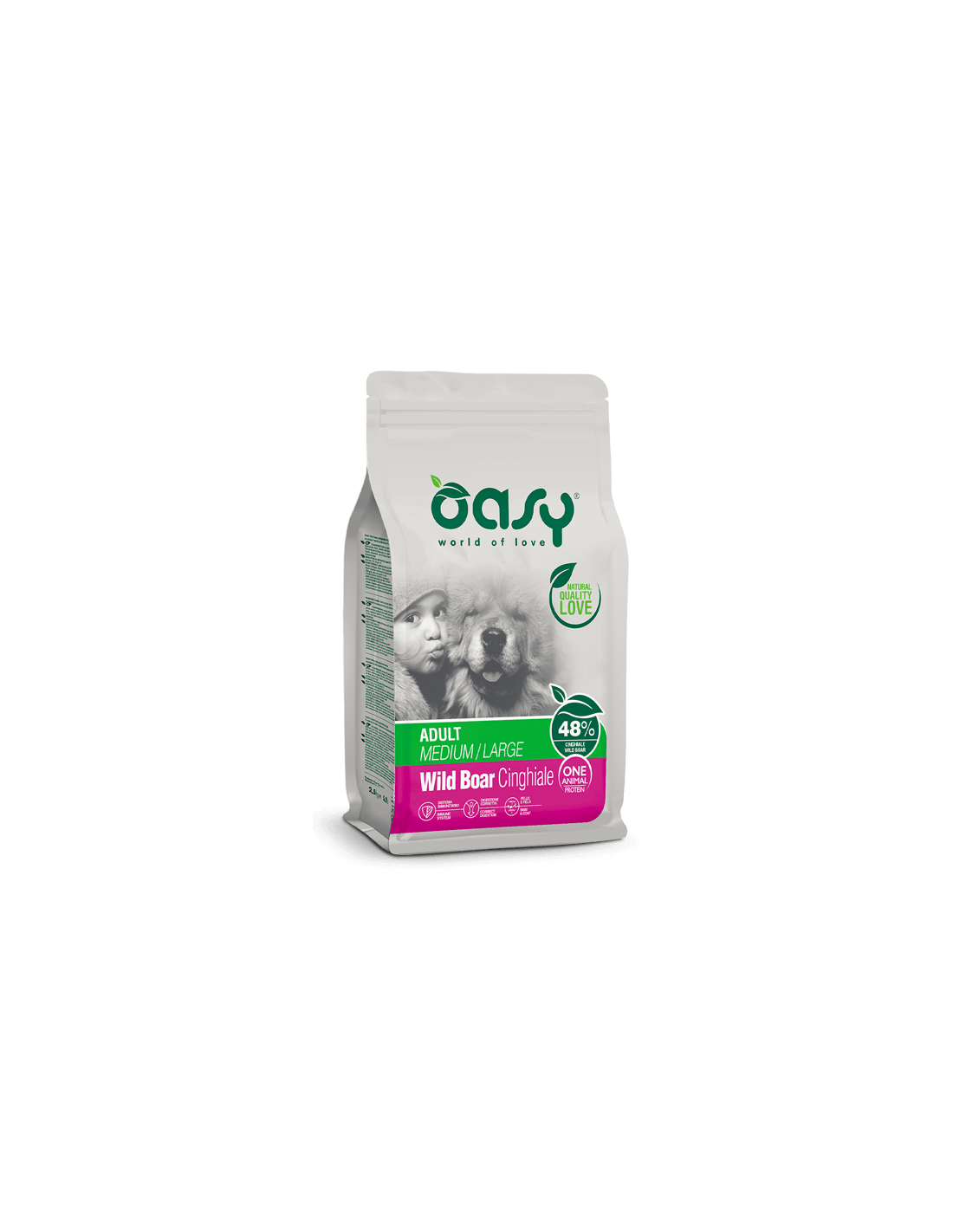 cinghiale fresco 30%, riso, cinghiale disidratato 15%, piselli, grasso animale, cinghiale idrolizzato 3%, polpa di barbabietola 3%, sostanze minerali, lievito di birra 1%, semi di lino, olio di pesce, inulina 1.000 mg/kg (fonte di fruttoligosaccaridi), zenzero, mannanoligosaccaridi 1.000 mg/kg, Yucca schidigera 170 mg/kg.