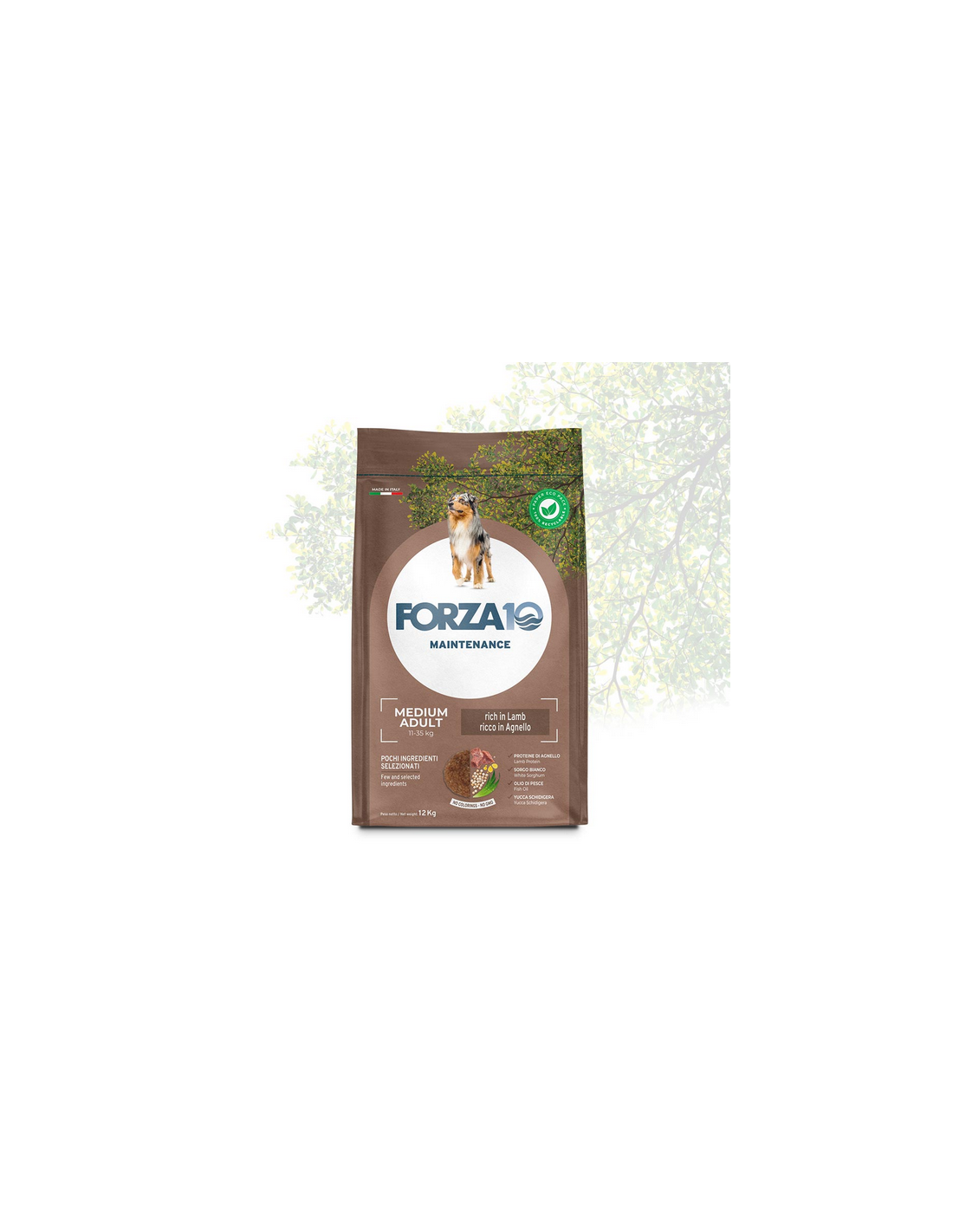 Composizione: proteine trasformate di agnello 26%, riso 26%, mais, sorgo bianco, polpa di barbabietola, grasso di pollo, olio di pesce, lievito di birra, sostanze minerali, lievito disidratato (Bio MOS), FOS, Yucca schidigera.