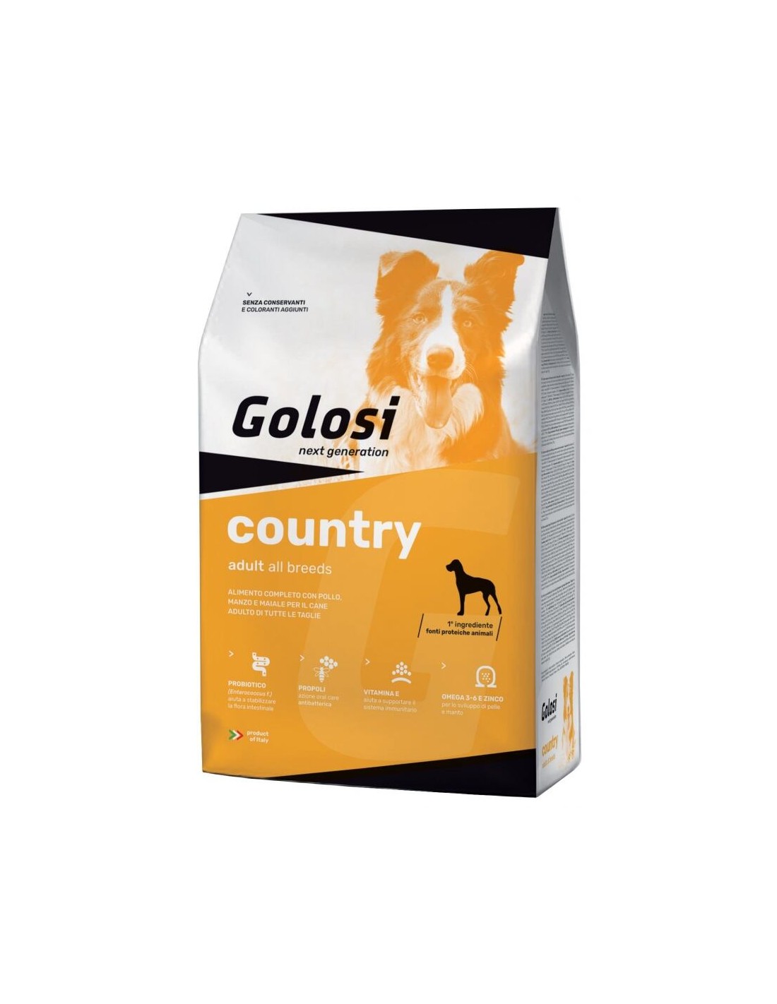 Golosi country è la soluzione nutrizionale ideale per il cane adulto di qualsiasi taglia: il pollo risulta leggero e digeribile mentre il manzo e il maiale donano grande appetibilità.