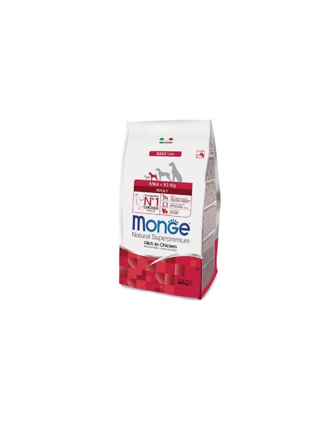 Le crocchette Monge Natural Superpremium Mini Adult al pollo sono preparate con una ricetta, a base di selezionate e pregiate carni bianche di pollo e riso, per un prodotto altamente digeribile e favorevole alla salute intestinale e l'equilibrio energetico dell'animale. Contenuto proteico calibrato e bilanciato: per un prodotto altamente digeribile; composto da pollo fresco abbinato ad un alto livello di colina cloruro e composto vitaminico-minerale delle alghe: per favorire l'assimilazione di tutte le sostanze nutritive in modo ottimale, riducendo al contempo il rischio di un accumulo eccessivo di colesterolo nel metabolismo dell'animale. Questa linea di cibo secco per cani si caratterizza per avere particolari crocchette di piccole dimensioni, specifiche per aiutare il tuo cane a mantenere un ottimale livello di energia per correre e giocare in piena libertà.