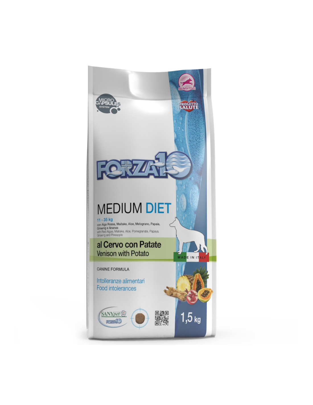 Composizione: proteine trasformate di cervo 19%, proteina di pisello, riso 15%, patata 8%, polpa di barbabietola, oli e grassi (di cui olio di pesce 3%), amido di pisello, lievito di birra, sostanze minerali, lievito disidratato (Bio MOS), FOS, oli e grassi vegetali, Grifola frondosa 0.027%, Yucca schidigera, prodotti e sottoprodotti della trasformazione di frutta e verdura fresca (Carica papaya 0.025%), prodotti ottenuti dalla trasformazione di vegetali (Ananas spp. 0.025%), prodotti ottenuti dalla trasformazione di erbe (Aloe vera 0.013%), alghe (Haematococcus pluvialis (astaxantina 0.005%)).