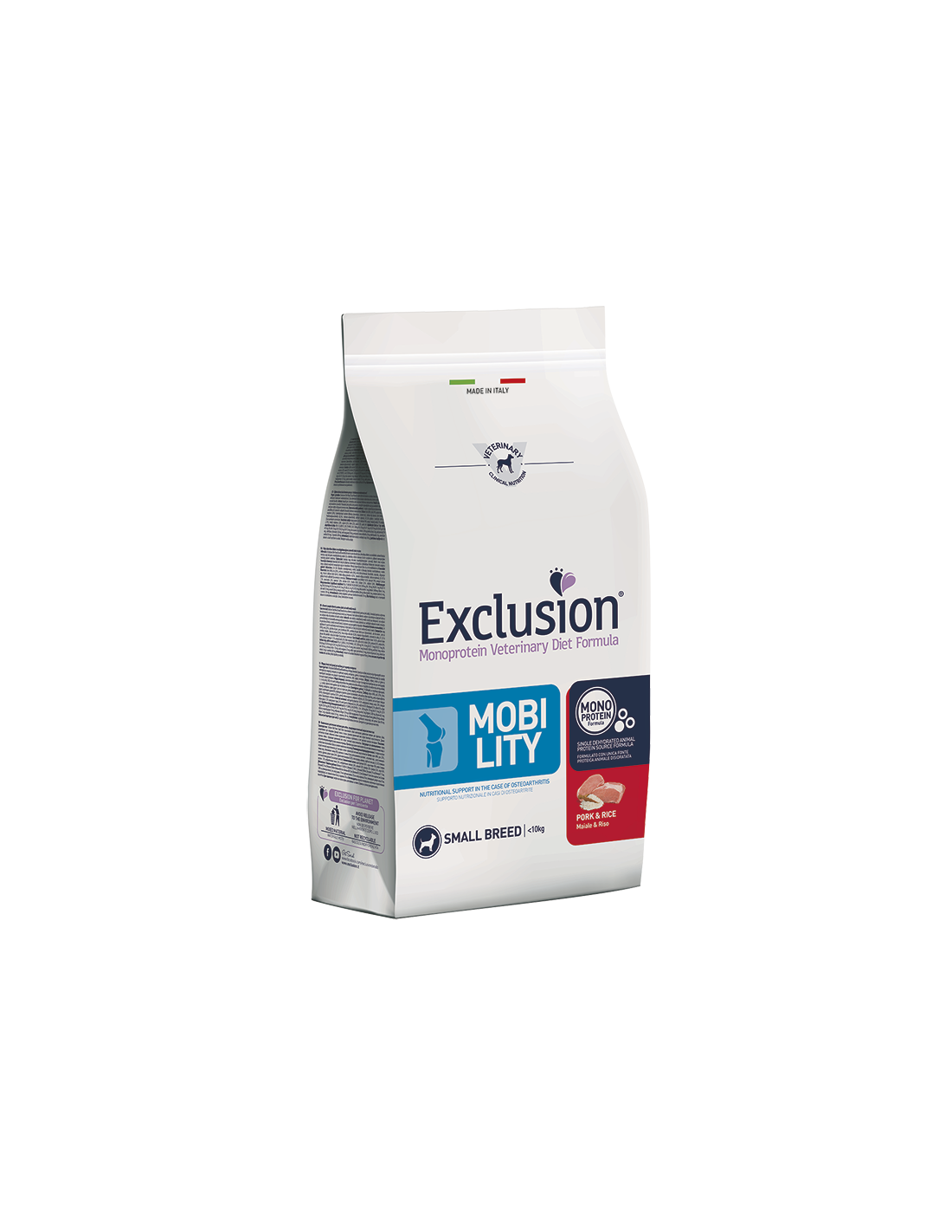 Exclusion Monoprotein Veterinary Diet Formula Mobility è un alimento dietetico con formulazione monoproteica, realizzato con un’unica fonte alternativa di proteine animali, ingredienti innovativi e preservato con tocoferoli naturali; rappresenta la risposta nutrizionale a disposizione del Veterinario, differenziata per taglia, come supporto nutrizionale per favorire la mobilità articolare.