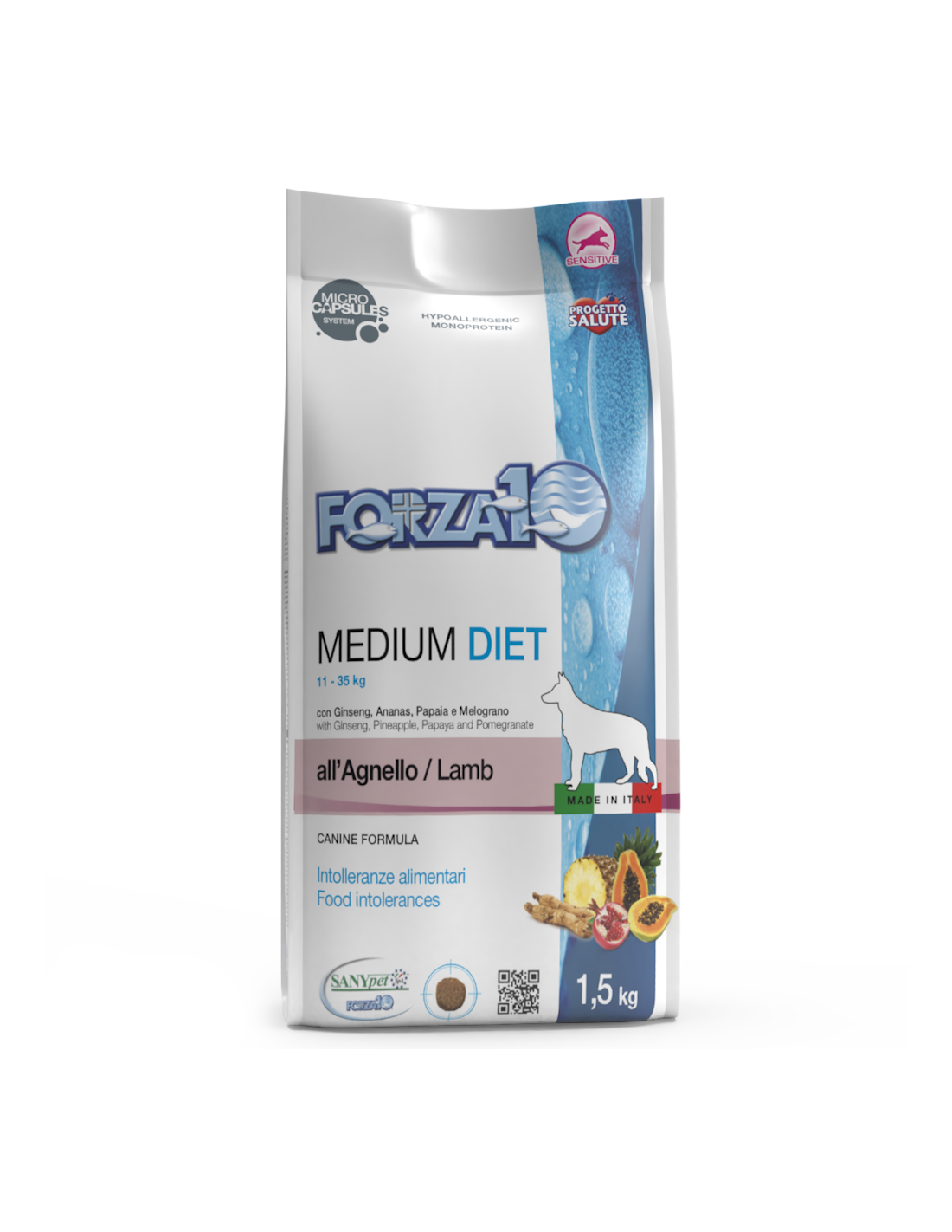 Forza10 Dog Diet Medium all’agnello 1,5 Kg è un alimento dietetico completo secco low grain, dedicato ai cani di taglia media, completo e bilanciato, per la riduzione delle intolleranze a ingredienti e sostanze nutritive. Queste crocchette sono a basso contenuto di cereali e aiutano il sistema intestinale ad una corretta peristalsi. Hanno un equilibrato rapporto Omega3 e Omega6 e grazie all’agnello, unica fonte proteica animale, sono altamente digeribile. Il cibo secco Forza10 garantisce il bilanciamento ideale di aminoacidi e minerali.