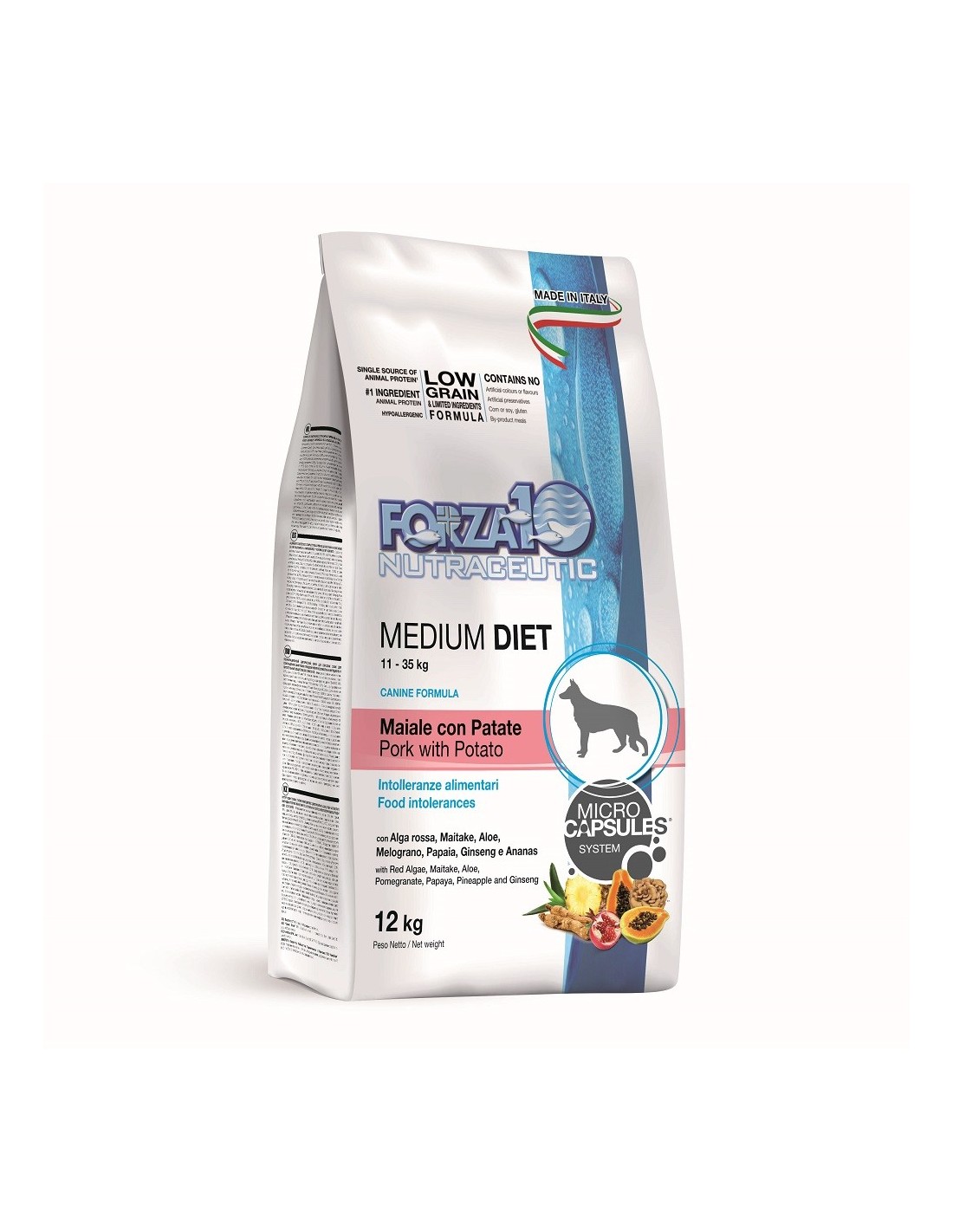 Alimento low grain, dedicato ai cani adulti di taglia media, completo e bilanciato, per la riduzione delle intolleranze a ingredienti e sostanze nutritive.