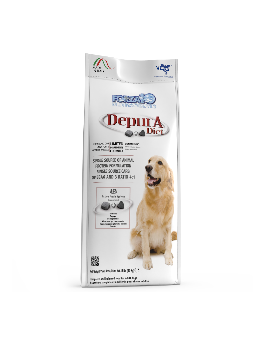 FORZA10 Depura è un alimento completo di mantenimento per cani adulti, studiato e realizzato come prosecuzione di un qualsiasi alimento Active.