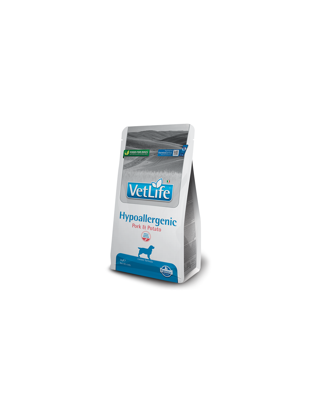 Farmina Vet Life Hypoallergenic Pork & Potato è un alimento dietetico completo, per cani, per la riduzione di intolleranze a ingredienti e sostanze nutritive; supporto alla funzione dermica in caso di dermatosi ed eccessiva perdita di peli.