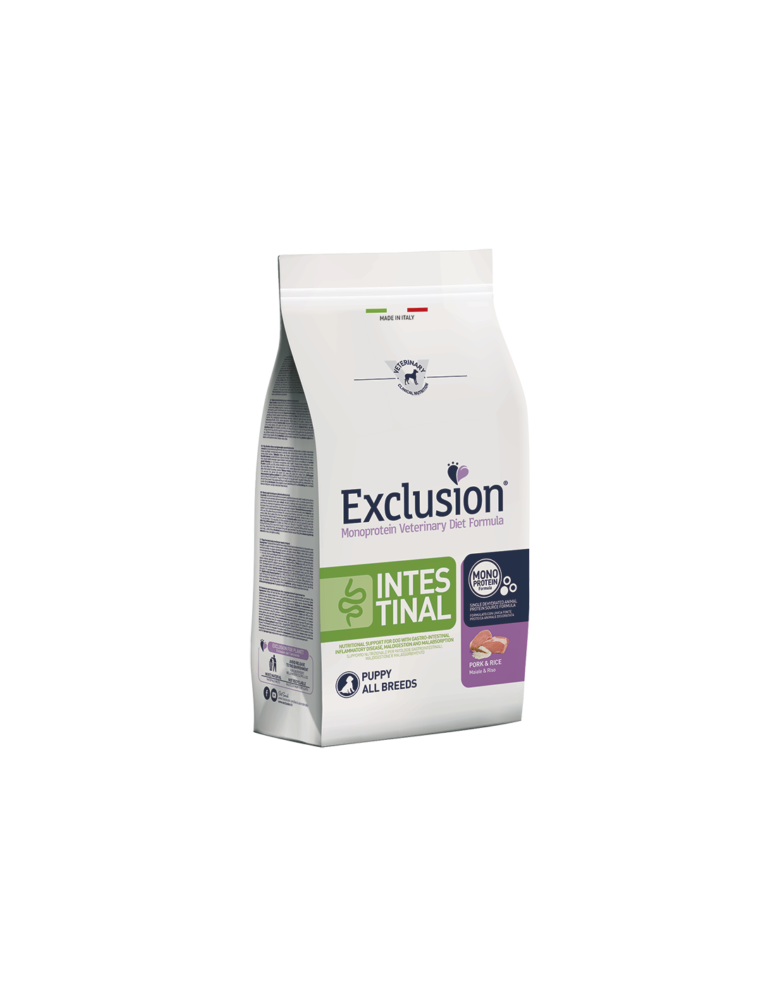 Exclusion Monoprotein Veterinary Diet Formula Intestinal è un alimento dietetico con formulazione monoproteica, realizzato con un’unica fonte alternativa di proteine animali, ingredienti innovativi e preservato con tocoferoli naturali; rappresenta la risposta nutrizionale a disposizione del Veterinario, differenziata per taglia, come supporto nutrizionale per cani con patologie gastrointestinali, maldigestione e malassorbimento.