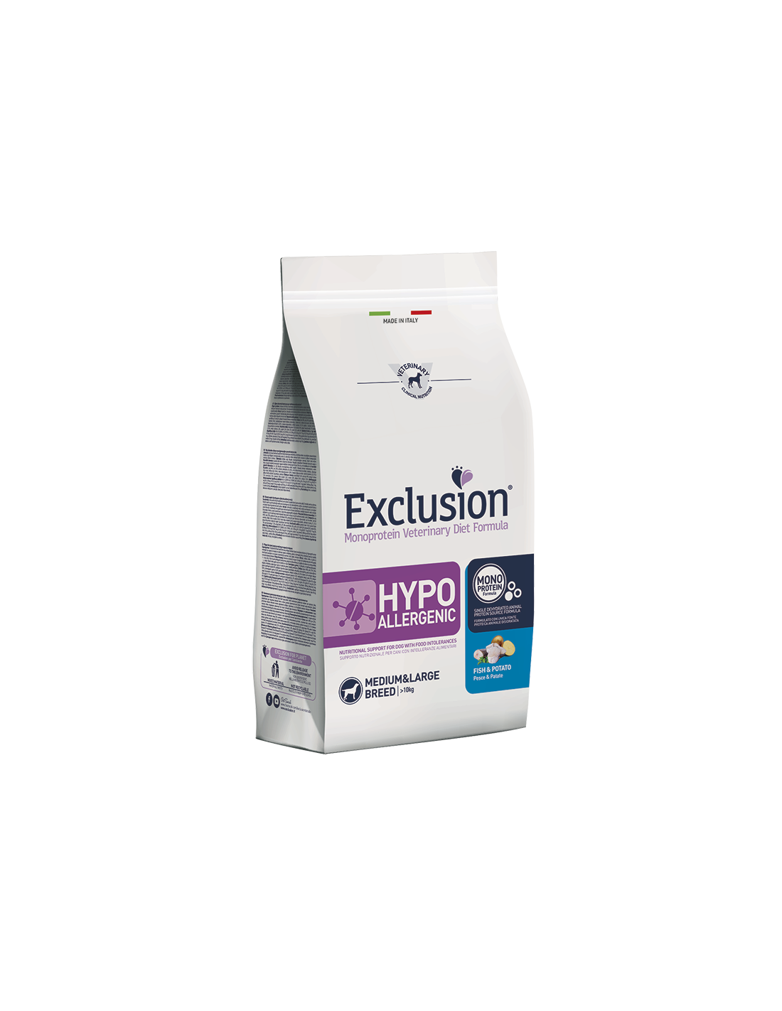 Exclusion Monoprotein Veterinary Diet Formula Hypoallergenic è un alimento dietetico con formulazione monoproteica, realizzato con un’unica fonte alternativa di proteine animali, ingredienti innovativi e preservato con tocoferoli naturali; rappresenta la risposta nutrizionale a disposizione del Veterinario, differenziata per taglia, come supporto nutrizionale per cani con intolleranze alimentari.