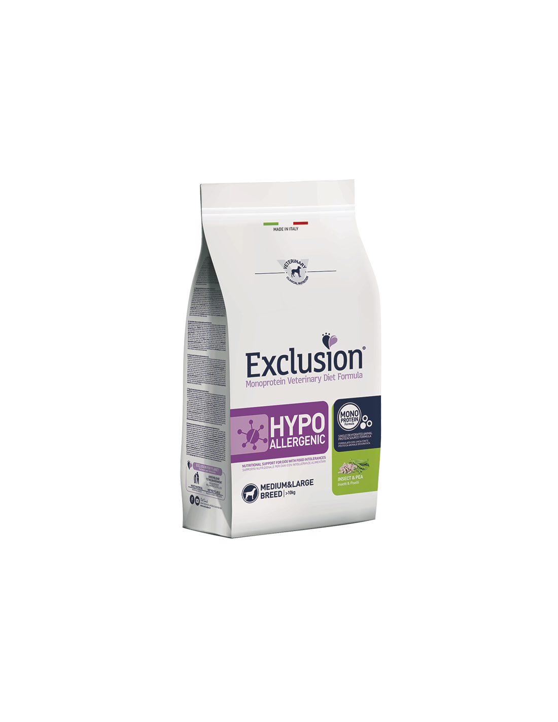 Exclusion Monoprotein Veterinary Diet Formula Hypoallergenic è un alimento dietetico con formulazione monoproteica, realizzato con un’unica fonte alternativa di proteine animali, ingredienti innovativi e preservato con tocoferoli naturali; rappresenta la risposta nutrizionale a disposizione del Veterinario, differenziata per taglia, come supporto nutrizionale per cani con intolleranze alimentari.