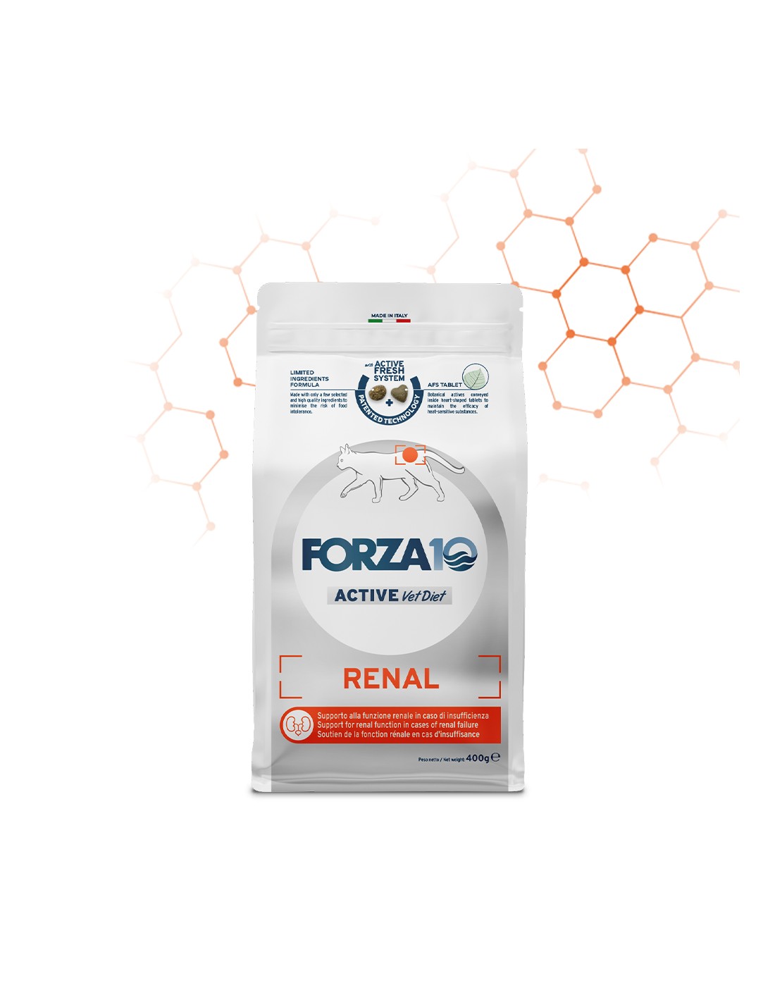 Forza 10 Renal Active è studiato come supporto della funzione renale in caso di insufficienza renale cronica o di temporanea insufficienza renale, questo grazie al ridotto tenore di proteine ma di elevata qualità e alla bassa concentrazione di fosforo. La speciale formulazione bi componente lo rende idoneo anche per supportare la funzione cardiaca in caso di insufficienza cardiaca cronica e nella riduzione di intolleranze a ingredienti e sostanze nutritive.