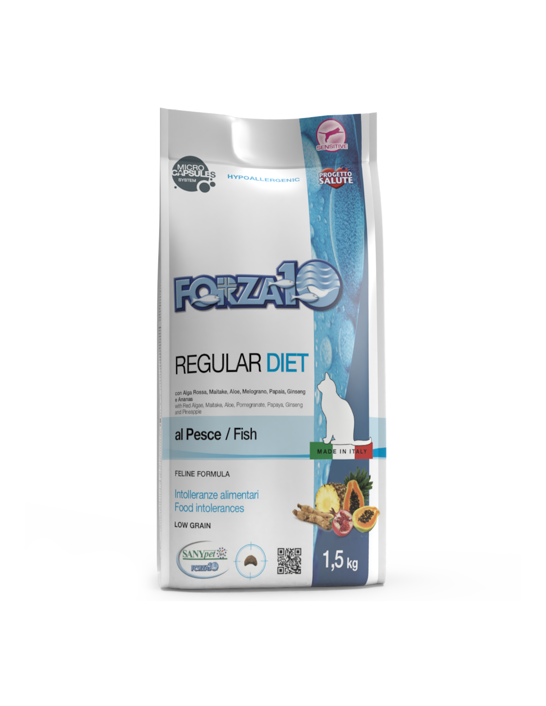 Composizione:farina di pesce 26%, riso macinato 26%, glutine di granturco, amido di pisello, oli e grassi (di cui olio di pesce 2%), lievito di birra, polpa di barbabietola, sostanze minerali, mannano oligosaccaridi (MOS), FOS, Grifola frondosa 0.027%, Yucca schidigera, prodotti e sottoprodotti della trasformazione di frutta e verdura fresca (Carica papaya 0.025%), prodotti ottenuti dalla trasformazione di vegetali (Ananas spp. 0.025%), prodotti ottenuti dalla trasformazione di erbe (Aloe vera 0.012%), alghe (Haematococcus pluvialis (astaxantina 0.005%)).