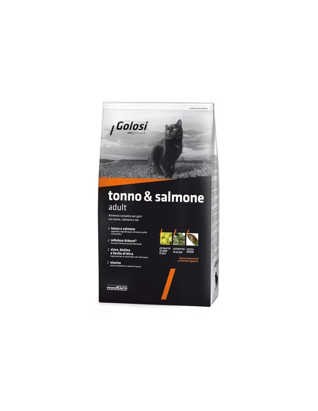 Carni e derivati, Cereali (Riso 4%), Pesci e sottoprodotti dei pesci (Tonno 8%, Salmone 8%), Oli e grassi (Grasso di pollo 5%), Sottoprodotti di origine vegetale (Cellulosa Arbocel® 0,5%, Inulina di cicoria – fonte di FOS – 0,1%), Lieviti (Lievito di birra 0,5%), Sostanze minerali, Molluschi e crostacei (Cozza verde sgusciata in polvere – Perna canaliculus - 0,005%).