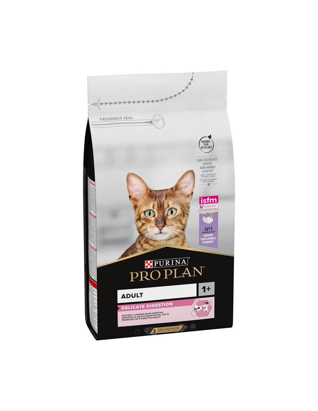 PURINA PRO PLAN ADULT 1+ DELICATE DIGESTION RICCO IN TACCHINO è un alimento completo per gatti adulti con una digestione sensibile o un appetito esigente.