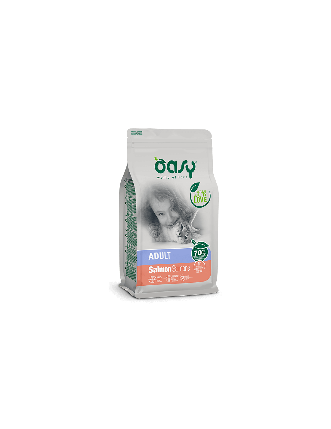 salmone fresco 40%, salmone disidratato 30%, riso 12%, mais, salmone idrolizzato 5%, glutine di mais, pollame disidratato, grasso di pollo, lievito di birra, proteina di riso, polpa di barbabietola 1%, olio di pesce, sostanze minerali, inulina 1.000 mg/kg (fonte di fruttoligosaccaridi), mannanoligosaccaridi 1.000 mg/kg, estratto di agrumi, Yucca schidigera.