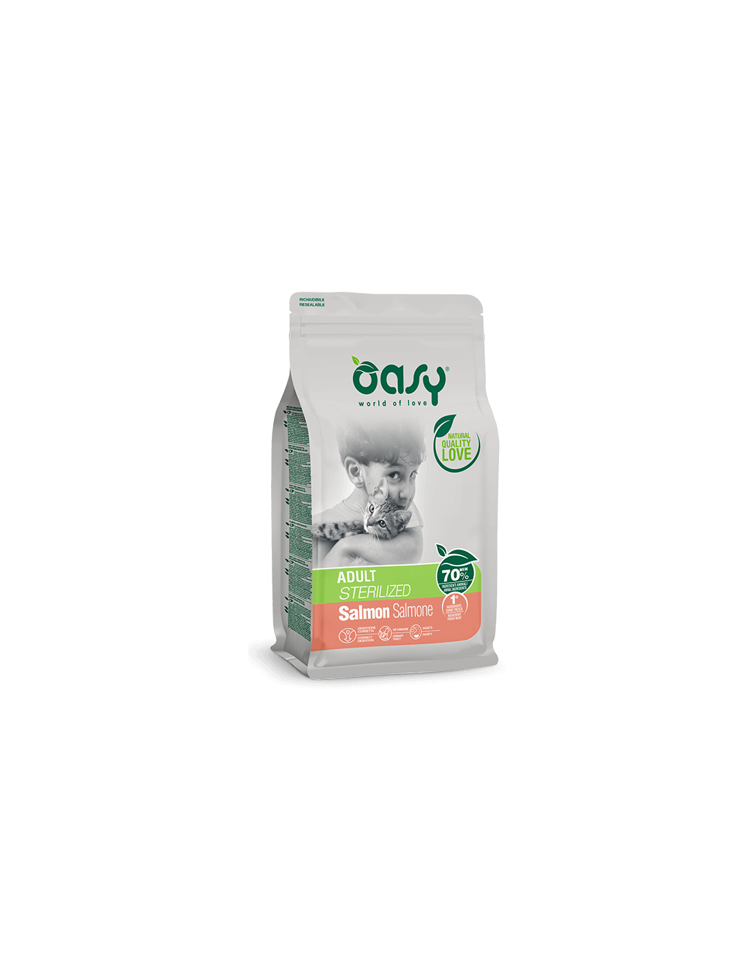 salmone fresco 40%, salmone disidratato 20%, riso 15%, salmone idrolizzato 5%, polpa di barbabietola 4,5%, fibre vegetali 3,5%, pollo idrolizzato 2%, pollo disidratato 2%, glutine di mais, mais, proteina di riso, grasso di pollo, pesce disidratato 1%, lievito di birra 1%, olio di pesce, sostanze minerali, inulina 1.000 mg/kg (fonte di fruttoligosaccaridi), mannanoligosaccaridi 1.000 mg/kg, estratto di agrumi 500 mg/kg, Yucca schidigera, acido linoleico coniugato.