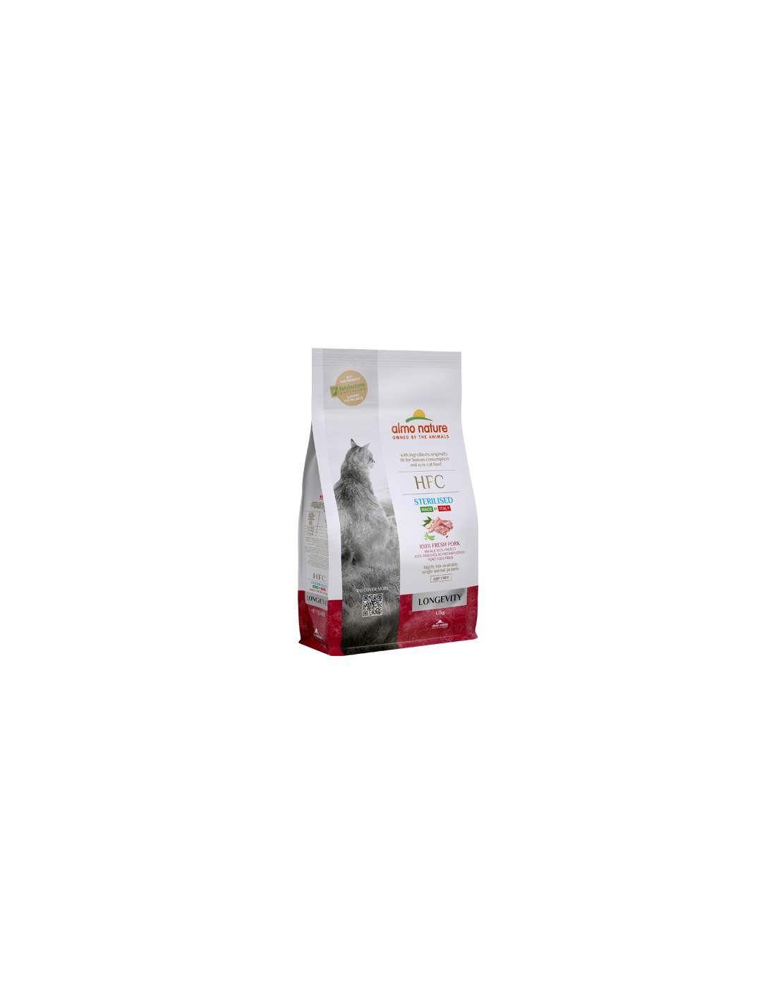 Maiale fresco 45%, proteine animali idrolizzate, riso 10,8%, sorgo bianco, piselli 7,2%, lievito, cellulosa 2%, sostanze minerali, grasso di pollo, mirtillo rosso disidratato 0,92%, inulina di cicoria (fonte di FOS) 0,1%, mannano-oligo-saccaridi 0,1%, glucosamina 0,03%, solfato di condroitina 0,02%, Yucca schidigera 0,01%.