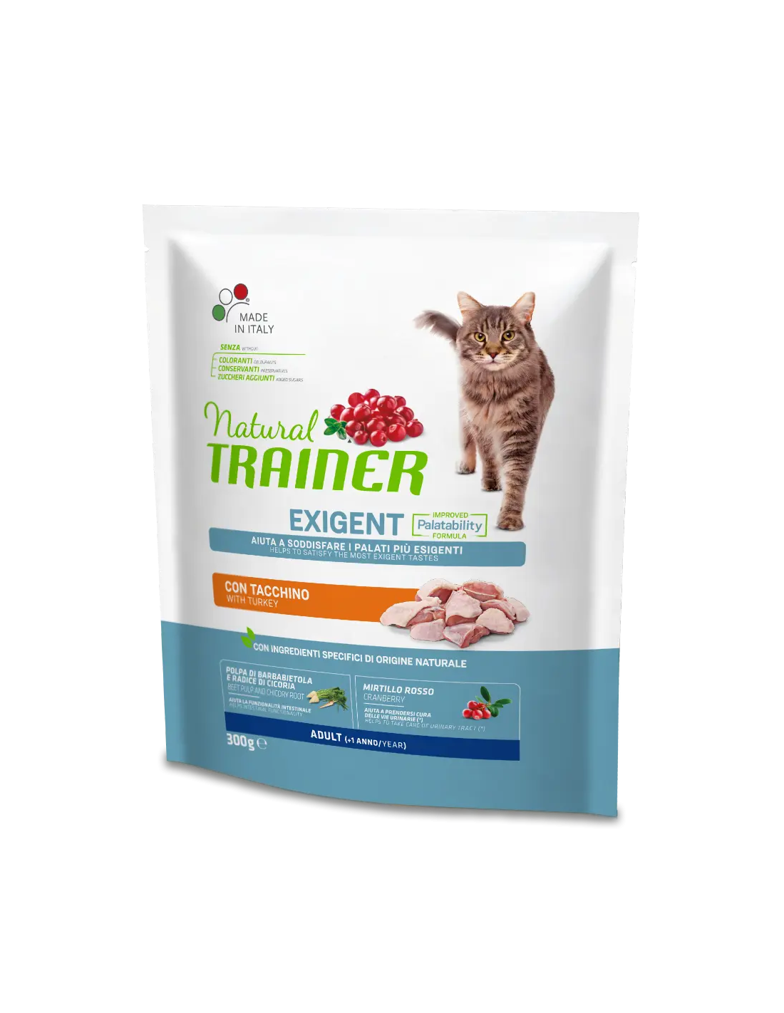 Composizione: tacchino 17% , proteine disidratate di pollo e tacchino , granturco , fioretto di granturco , riso , proteina di granturco , proteine disidratate di manzo , piselli disidratati , strutto , proteine animali idrolizzate (pollame, maiale, pesce) , polpa di barbabietola* 2% , semi di lino* , proteina di pisello , olio di pesce , sostanze minerali , concentrato secco di radice di cicoria (fonte di inulina)* 0,8% , fibra di pisello* , olio di granturco , mirtillo rosso disidratato* 0,02%. , *Ingredienti specifici di origine naturale.
