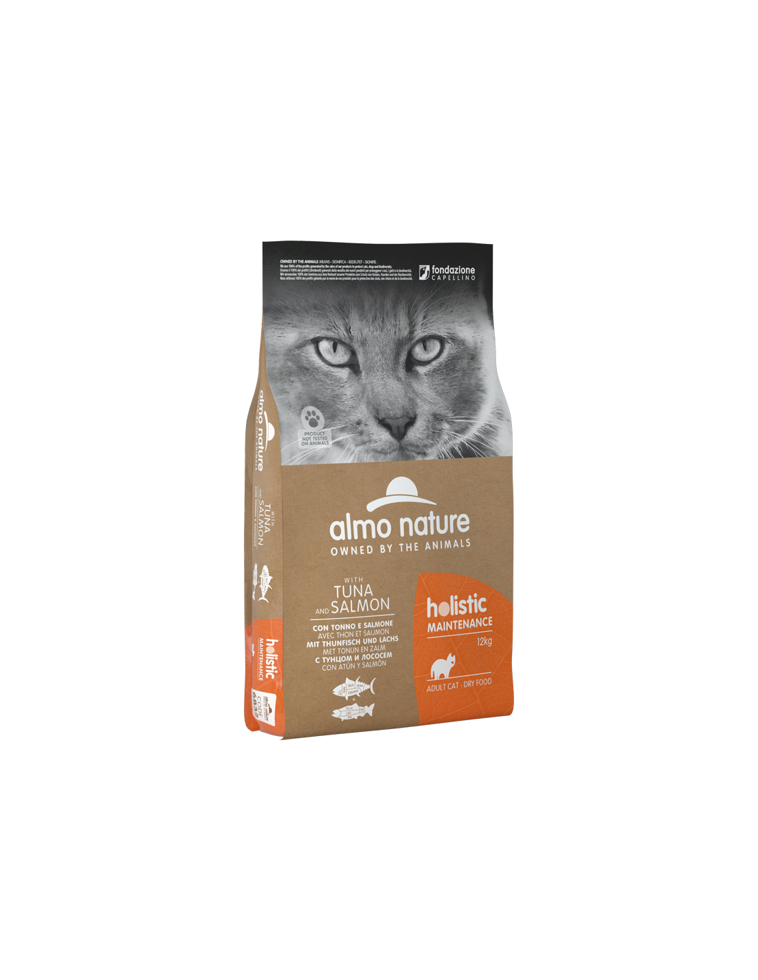 Carni e derivati, cereali (riso 4%), pesci e sottoprodotti dei pesci (tonno* 8%, salmone* 8%), oli e grassi (grasso di pollo 5%), sottoprodotti di origine vegetale (cellulosa 0,5%, inulina di cicoria - fonte di FOS- 0,1%), lieviti, sostanze minerali. *Fonte naturale di omega 3.
