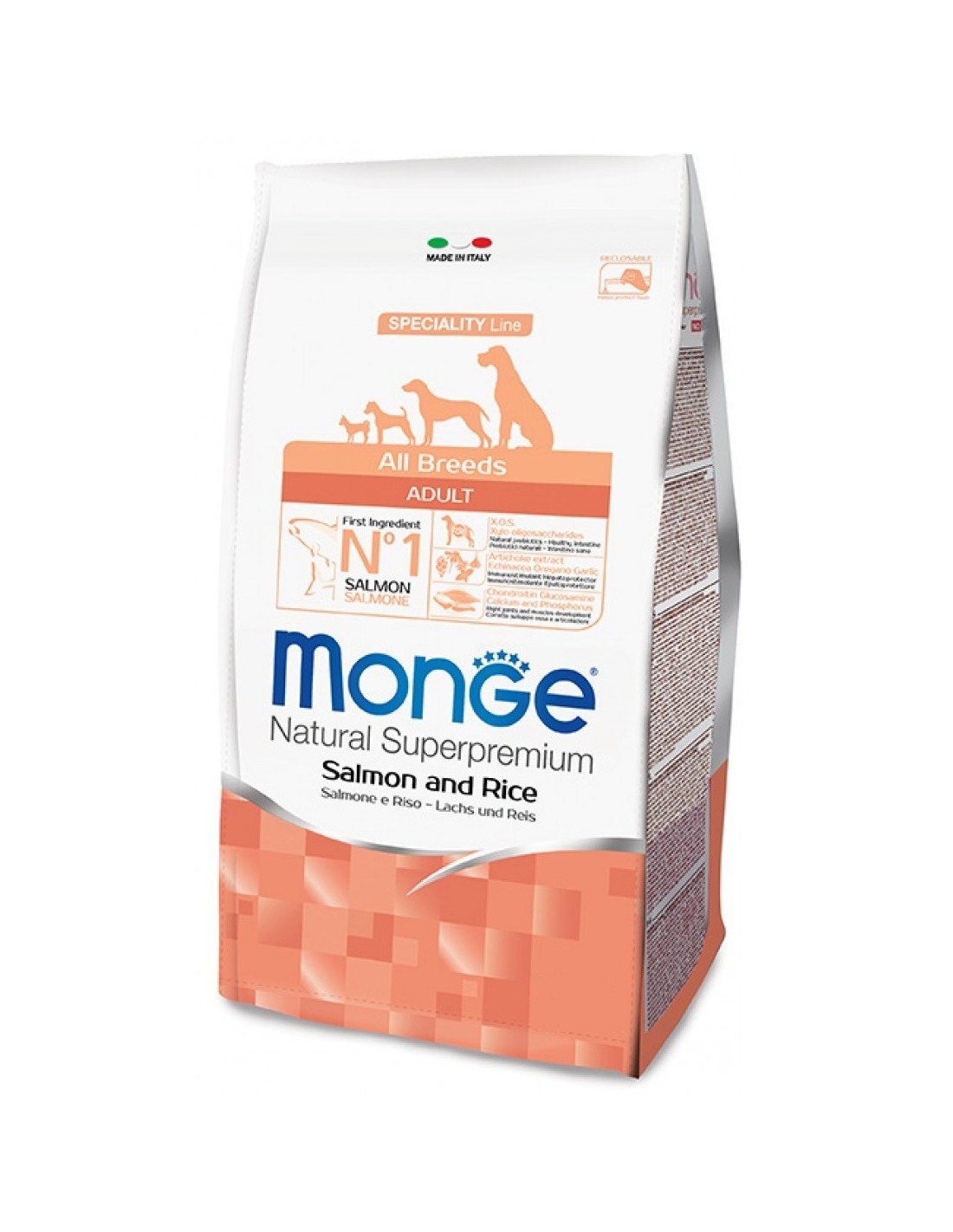 COMPOSIZIONE: Pesce (salmone disidratato 26% e fresco 10%), riso, granturco, grassi animali (olio di pollo purificato al 99,5%), proteine