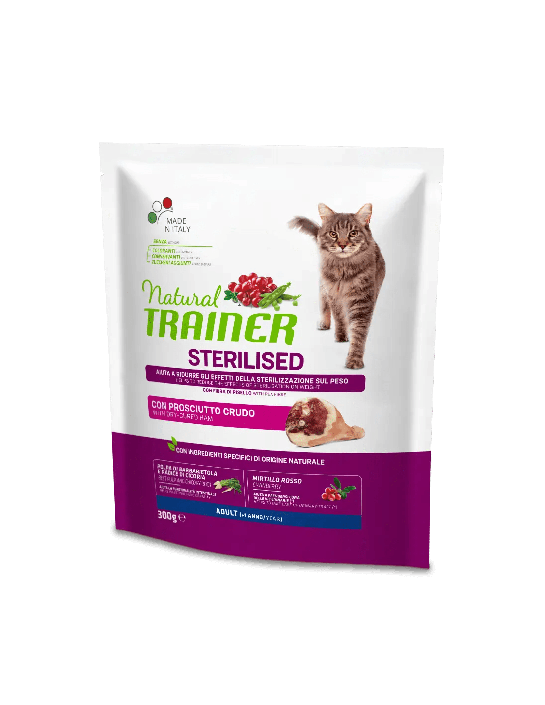 Composizione: pollo fresco , granturco , riso , proteina di granturco , proteine disidratate di pollo e tacchino , proteine disidratate di prosciutto crudo 100% italiano 6,5% , piselli disidratati 5% , fioretto di granturco , proteine disidratate di maiale , proteine disidratate di manzo , strutto , polpa di barbabietola* 2,1% , fibra di pisello* 2% , proteine animali idrolizzate (pollame, maiale, pesce) , proteine disidratate di salmone , semi di lino* , proteina di pisello , sostanze minerali , concentrato secco di radice di cicoria (fonte di inulina)* 0,8% , olio di granturco , mirtillo rosso disidratato* 0,02%. , *Ingredienti specifici di origine naturale.