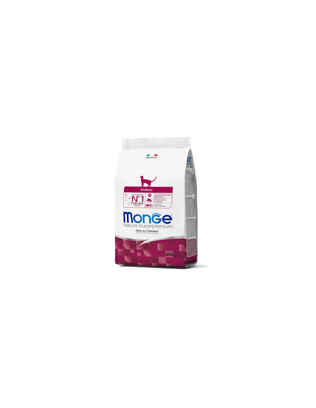 Pollo (fresco 10%, disidratato 26%), riso, grasso animale (olio di pollo contenuto in grassi 99,6%, conservato con antiossidanti naturali), polpa di barbabietola, glutine di granturco, proteine animali idrolizzate, farina di uovo intero (ricco in proteine nobili), pesce (salmone disidratato), olio di pesce (olio di salmone), lievito di birra (fonte di M.O.S. e vitamina B12), fibra insolubile di pisello, taurina, X.O.S. (Xylo - oligosaccaridi 3 g/kg), idrolizzato di lievito (M.O.S.), yucca schidigera, rosa canina.