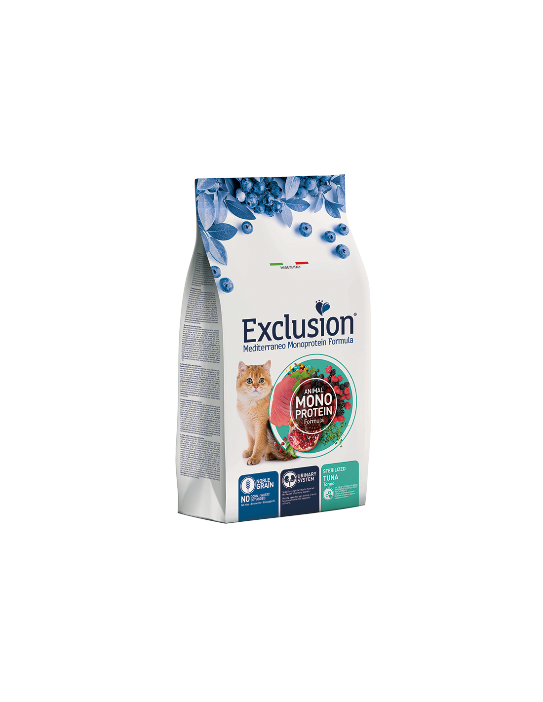 Exclusion Mediterraneo Monoprotein Formula – Noble Grain é un alimento completo e bilanciato, formulato con una sola fonte proteica animale disidratata, per una ricetta chiara ed essenziale, e con solo un cereale nobile di alta qualità. La specifica formulazione aiuta il buon funzionamento delle vie urinarie ed è preservato con antiossidanti naturali. È realizzato con una innovativa ricetta con Superfood della tradizione Mediterranea: melagrana, more, lamponi e mirtilli neri. È arricchito con Psyllium per aiutare a contrastare la formazione dei boli di pelo. Senza grasso di pollo, frumento, soia e mais aggiunti.