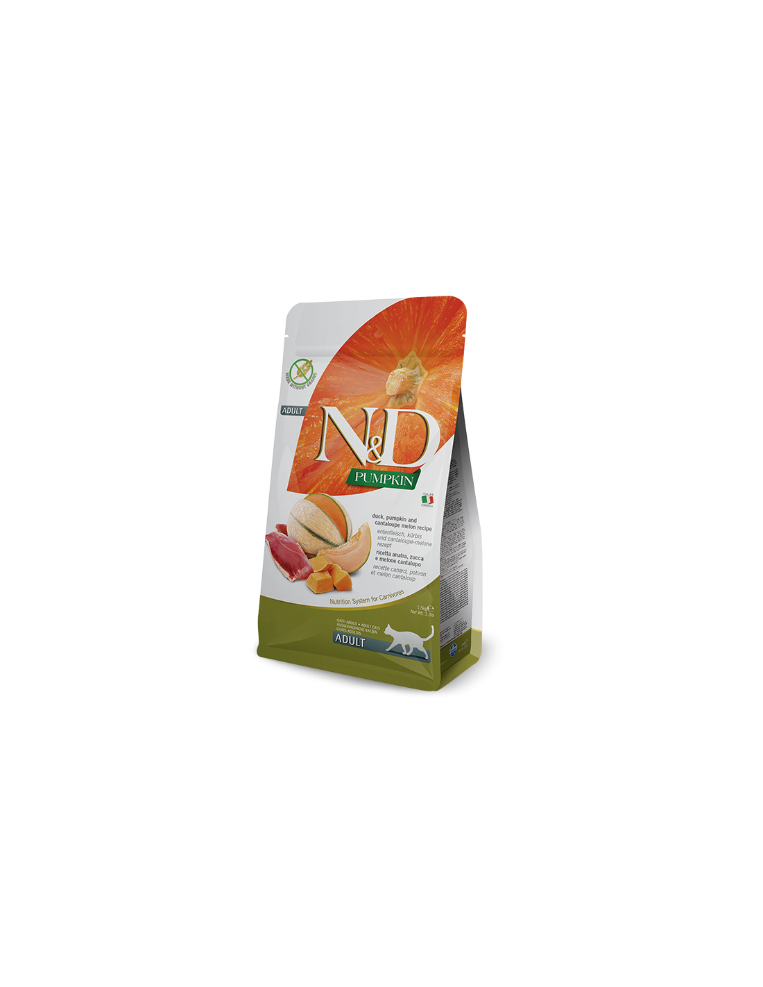 composizione:anatra disossata (30%), proteine di anatra disidratate (28%), amido di piselli, grasso di pollo, zucca disidratata (5%), uova essiccate, aringa, proteina di aringa disidratata, olio di pesce (da aringa), carote essiccate, farina di erba medica, inulina, fruttoligosaccaridi, estratto di lievito (fonte di manno-oligo-saccaridi), melone cantaloupe essiccato (0.5%), melagrano essiccato, mela essiccata, spinaci essiccati, bucce e semi psillio (0.3%), arancia dolce essiccata, mirtillo essiccato, cloruro di sodio, lievito di birra essiccato, curcuma (0.2%), estratto di aloe vera.