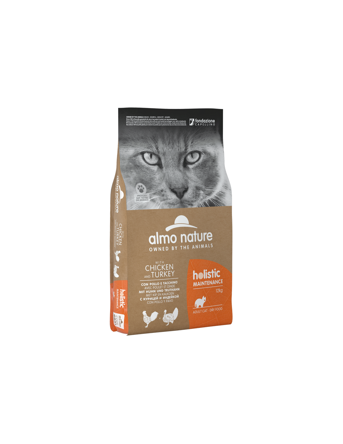 Carni e derivati 48,5% (pollo e tacchino 28%), cereali (riso 4%), oli e grassi (grasso di pollo 4,6%), sottoprodotti di origine vegetale (cellulosa 0,5%, inulina di cicoria - fonte di FOS- 0,1%), lieviti, sostanze minerali.