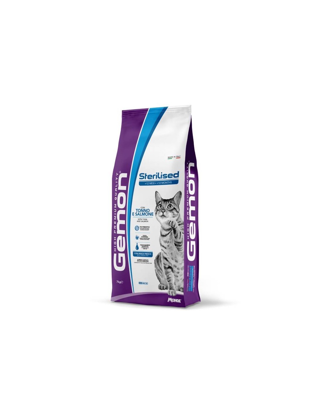 Composizione: Cereali (riso 4%), pesci e sottoprodotti dei pesci 30% (tonno fresco 8% e salmone fresco 8%), carni e derivati, ortaggi (polpa di barbabietola 2%), oli e grassi (olio di salmone 1%), sottoprodotti di origine vegetale (fruttoligosaccaridi FOS 0,5% e yucca schidigera 0,1%), sostanze minerali, lieviti (mannano-oligo-saccaridi MOS 0,5%)