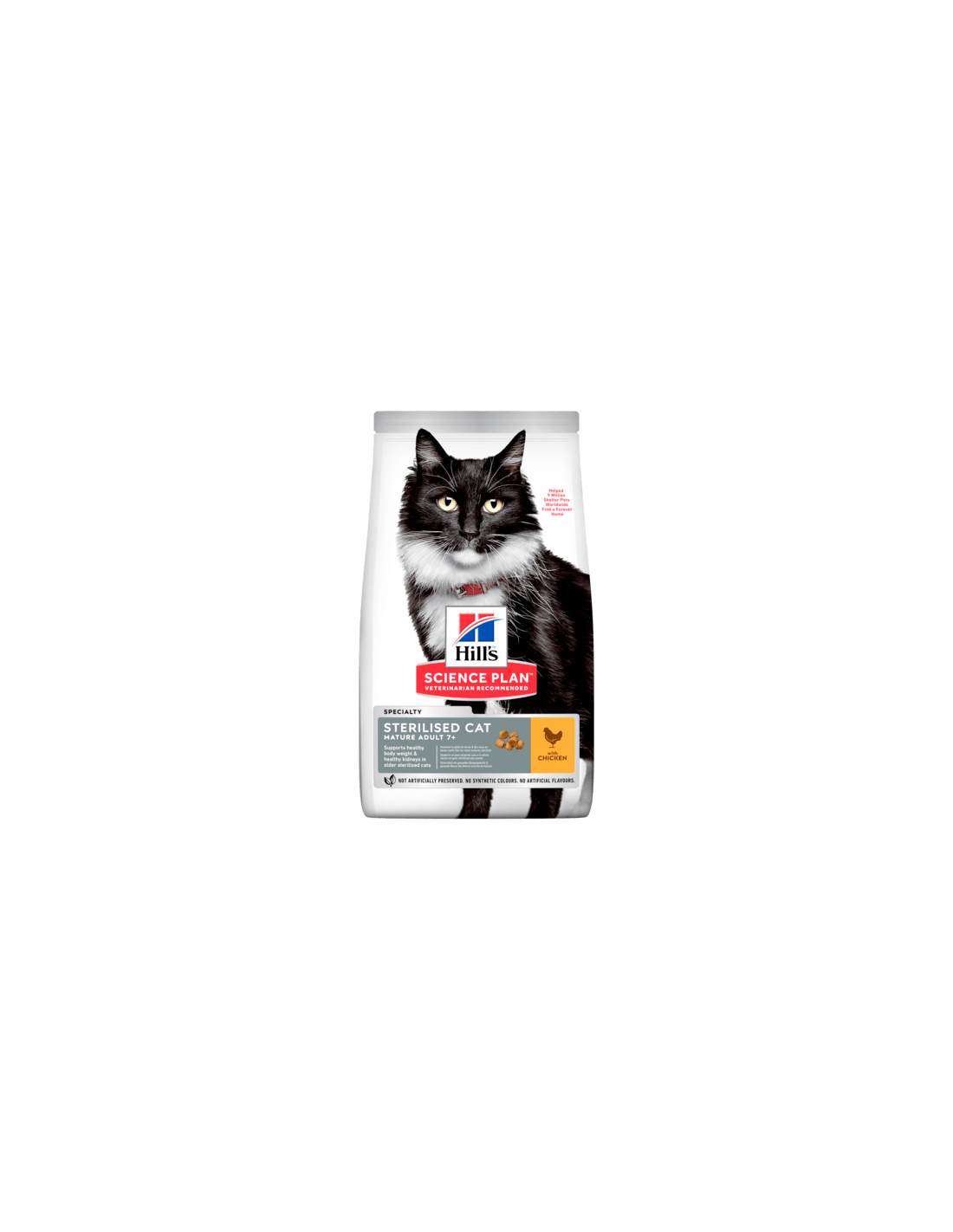 Hill's Science Plan Sterilized Cat Mature Adult ha una Formula unica del Mantenimento del Peso per aiutare i gatti anziani sterilizzati a mantenersi magri. Realizzato con ingredienti di elevata qualità, facili da digerire.