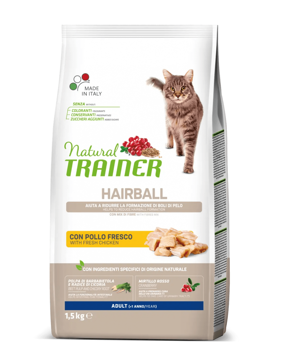 Composizione: pollo fresco 18% , proteine disidratate di pollo e tacchino 17% , proteina di granturco , granturco , riso , strutto , piselli disidratati , polpa di barbabietola* 3,2% , proteine animali idrolizzate (pollame, maiale, pesce) , fibra di avena* 2% , cellulosa* , semi di lino* , proteina di pisello , fibra di pisello* , sostanze minerali , concentrato secco di radice di cicoria (fonte di inulina)* 0,8% , lignocellulosa , olio di granturco , mirtillo rosso disidratato* 0,02%. , *Ingredienti specifici di origine naturale.