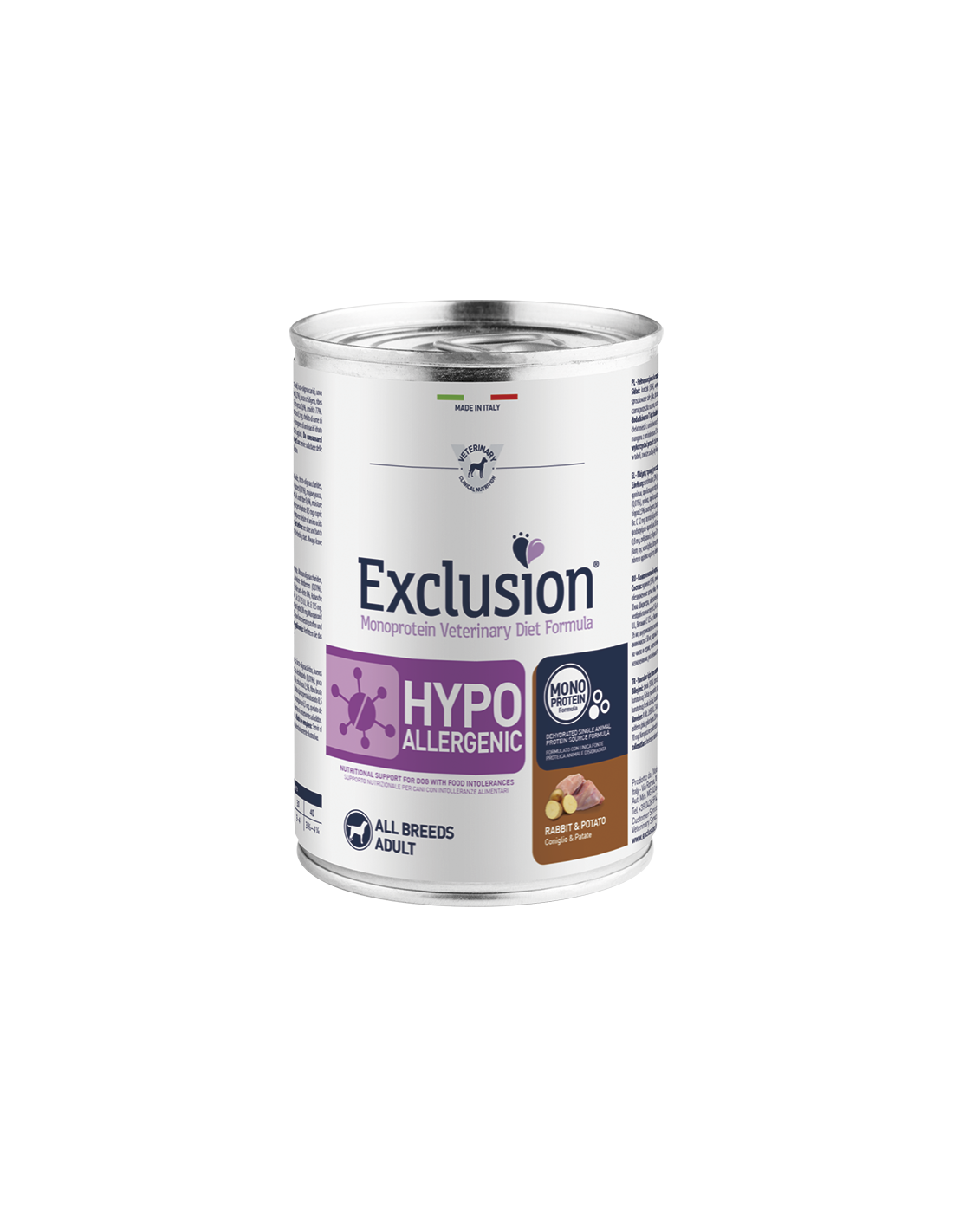 Exclusion Monoprotein Veterinary Diet Formula Hypoallergenic è un alimento dietetico con formulazione monoproteica, realizzato con un’unica fonte alternativa di proteine animali, ingredienti innovativi e preservato con tocoferoli naturali; rappresenta la risposta nutrizionale a disposizione del Veterinario, differenziata per taglia, come supporto nutrizionale per cani con intolleranze alimentari.