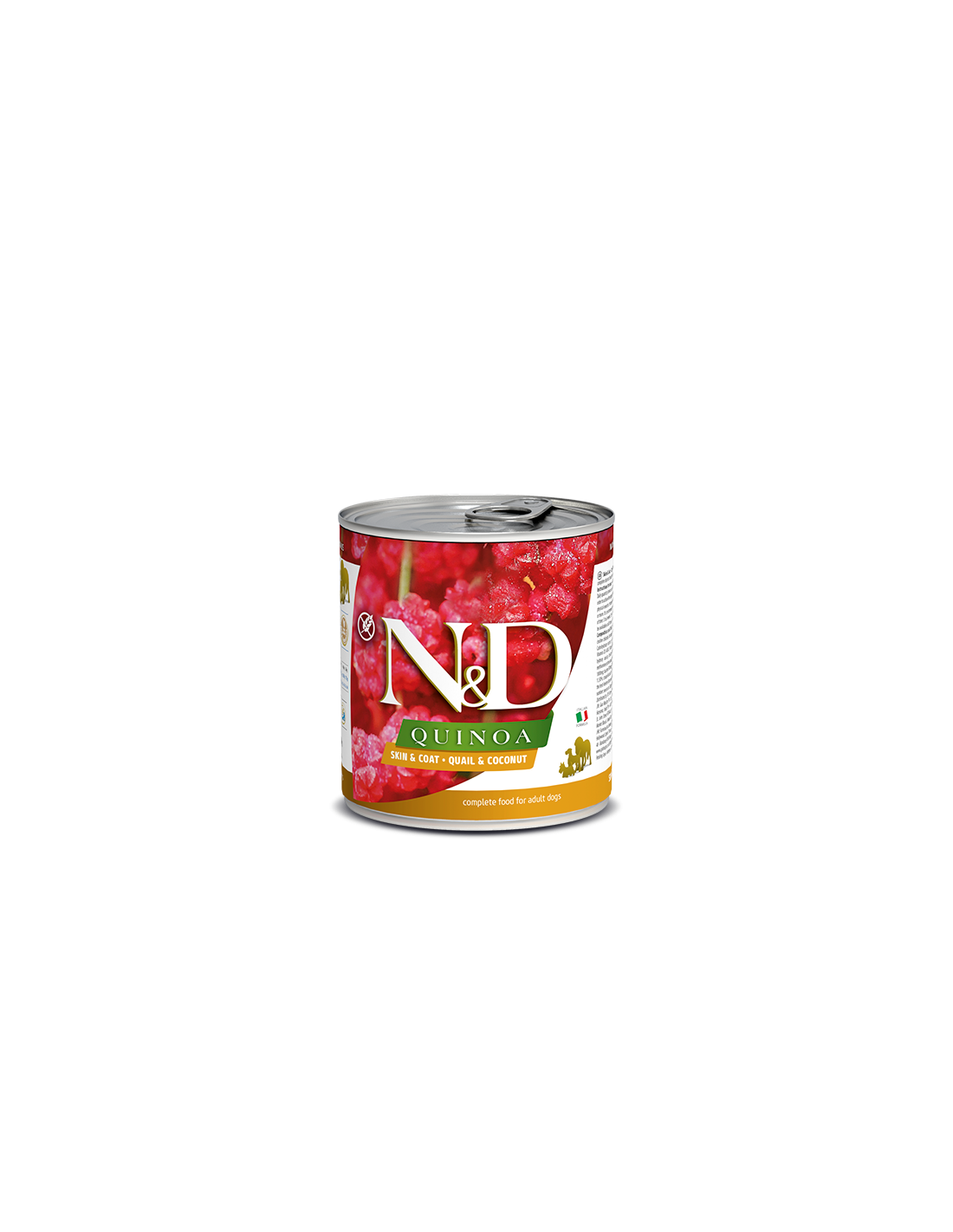 composizione:filetto di quaglia e coscia (55%), semi di quinoa estratti (5%), olio di pesce, cocco (4%), fruttoligosaccaridi, solfato di condroitina, glucosamina, vitamine, minerali. Fonti proteiche: filetto di quaglia e coscia. Fonti di carboidrati: semi di quinoa estratti.
