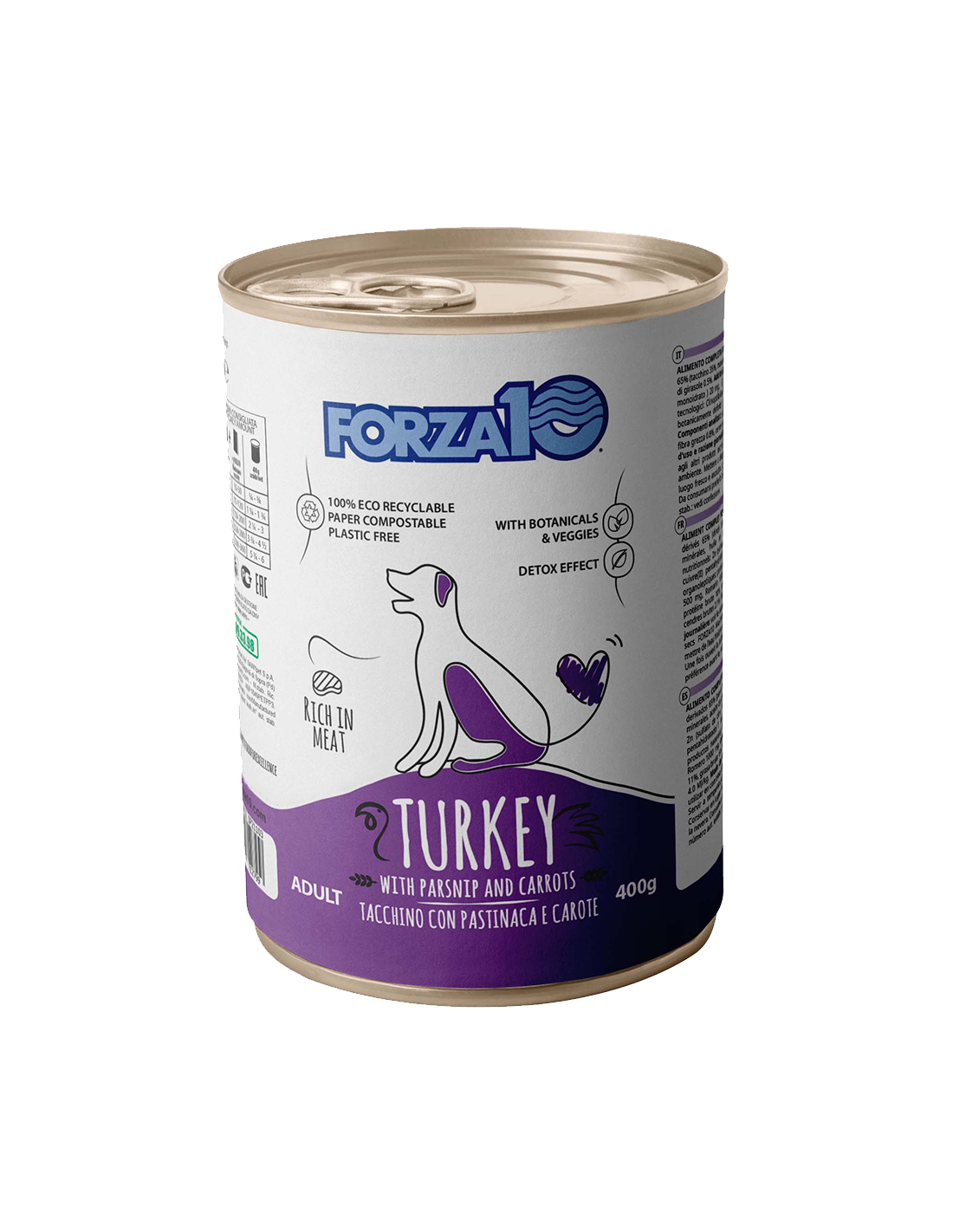Composizione: carni e derivati 65% (tacchino 35%), pastinaca 4%, carote 4%, sostanze minerali, olio di girasole 0.5%, rosmarino 0.1%, curcuma 0.05%.