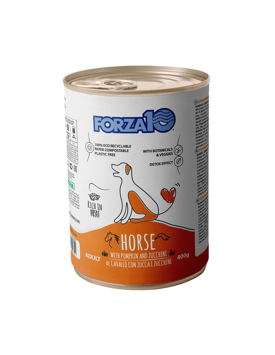 Composizione: carni e derivati 65% (cavallo 14%), zucca 4%, zucchine 4%, sostanze minerali, olio di girasole 0.5%, tarassaco 0.2%, curcuma 0.05%.